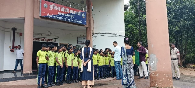 प्रतापपुर,02 जुलाई 2025 (घटती-घटना)। एक निजी स्कूल के बच्चों ने शिक्षकों के साथ खड़गवां पुलिस चौकी का भ्रमण किया।प्रभारी योगेंद्र जायसवाल ने उन्हें पुलिस के काम करने का तरीका समझाया तथा कानून की जानकारी दी। स्कूल प्रबंधन ने प्रभारी के स्थानांतरण पर उपहार के साथ शुभकामनाएं भी दीं।