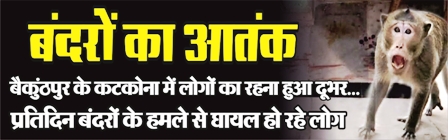 बैकुंठपुर/पटना,05 जुलाई 2025 (घटती-घटना)। कोरिया जिले के बैकुंठपुर विकासखंड के ग्राम कटकोना में बंदरों का आतंक अब ग्रामवासियों को भयभीत कर रहा है और प्रतिदिन रहवासी बंदरों के हमले के शिकार हो रहे हैं और कई मामलों में बुरी तरह घायल हो रहे हैं और एक मामले में एक व्यक्ति की मृत्यु भी हो चुकी है जैसी सूचना मिल रही है।