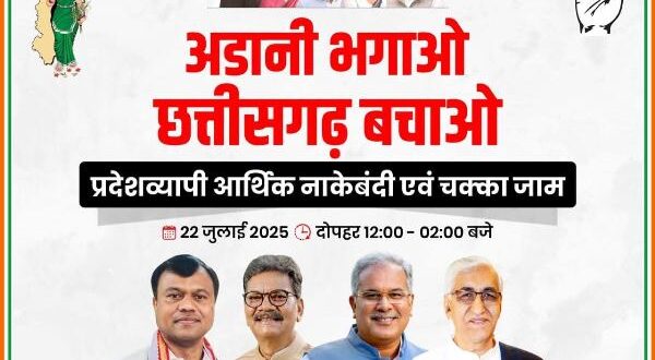 अंबिकापुर,21 जुलाई 2025 (घटती-घटना)। प्रदेश कांग्रेस कमेटी ने अडानी के व्यापारिक हितों की रक्षा करने के भाजपा सरकार के रवैये की आलोचना करते हुए 22 जुलाई को प्रदेशव्यापी आर्थिक नाकेबंदी और चक्काजाम का ऐलान किया है।
