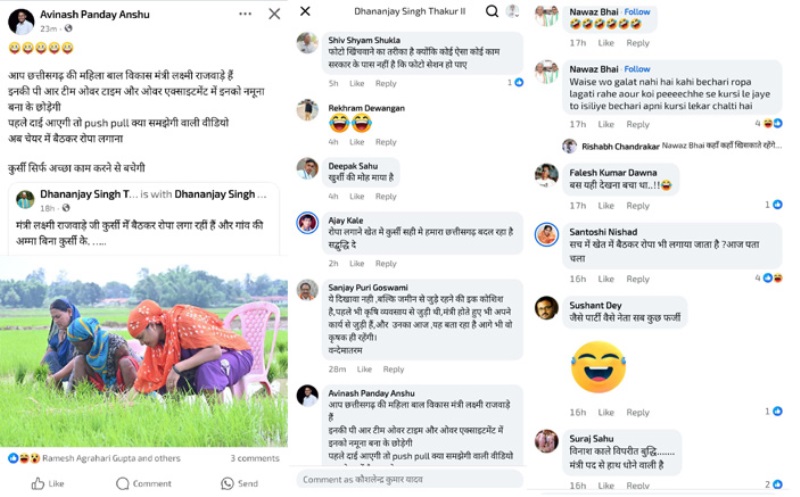 प्रदेश की एकमात्र महिला मंत्री का अपने धान के खेत में धान रोपाई किया जाना और वह भी कुर्सी पर बैठकर धान रोपाई किया जाना उसकी तस्वीर को सोशल मीडिया पर साझा करना लोगों के लिए भी आलोचक बनकर आलोचना का विषय बन गया है,लोगों का कहना है कि मंत्री जी का लगाव जमीन से नहीं रह गया है उनका जुड़ाव कुर्सी से हो चुका है जिसके कारण वह धान के खेत में भी कुर्सी लेकर पहुंच रही हैं और रोपाई के दौरान फोटो खिंचवाकर सोशल मीडिया में साझा कर रही हैं। सोशल मीडिया में इस समय मंत्री जी के इस पोस्ट के बाद लोगों की प्रतिक्रियाओं की बाढ़ सी आई हुई है और लोग इसे इस मामले में अपनी प्रतिक्रिया देने से पीछे नहीं हट रहे हैं और प्रतिक्रियाएं भी आलोचना वाली हैं। लोगों की प्रतिक्रियाओं में यह भी देखने को मिला कि उन्होंने लिखा है कि गांव की महिलाएं कीचड़ में और मंत्री जी कुर्सी पर यह जमीन से जुड़ाव कैसे जब अन्य कीचड़ में हैं और वह कुर्सी पर।