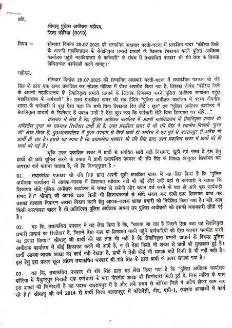 पुलिस अधीक्षक कार्यालय कोरिया में पदस्थ राजीव गुप्ता जो सउनि के द्वारा एक शिकायत पत्र पुलिस अधीक्षक कोरिया को सौंपा गया है जिसमें उन्होंने दैनिक घटती-घटना की खबर का उल्लेख कर पत्रकार की जांच करवाने की मांग की है,मानसिक परेशानी और कई तरह की बात छवि धूमिल होने की बात उन्होंने शिकायत में लिखी है,क्या यह शिकायत सेवानिवृत्त प्रभारी प्राचार्य महाविद्यालय बैकुंठपुर के द्वारा एक षड्यंत्र के तहत कराई जा रही है जिससे लोगों का ध्यान महाविद्यालय के प्रभारी प्राचार्य रहे और फिलहाल सेवानिवृत्त हो चुके प्रभारी प्राचार्य की कारगुज़ारियों से हट सके। राजीव गुप्ता का गुस्सा और खीज साफ नजर आती है शिकायत में और यह एक भय उत्पन्न करने का भी विषय बन रहा है जिसके माध्यम से वह पत्रकार को पुलिस का भय दिखाना चाहते हैं जिससे पत्रकार उनके रिश्तेदार प्रभारी सेवानिवृत हो चुके महाविद्यालय के प्राचार्य की कारगुज़ारियों के प्रकाशन से दूर हट जाए और वह उच्च शिक्षा संस्थान में भ्रष्टाचार के बड़े मामले को दबा सकें।
