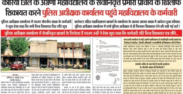 पुलिस अधीक्षक कार्यालय कोरिया में पदस्थ राजीव गुप्ता जो सउनि के द्वारा एक शिकायत पत्र पुलिस अधीक्षक कोरिया को सौंपा गया है जिसमें उन्होंने दैनिक घटती-घटना की खबर का उल्लेख कर पत्रकार की जांच करवाने की मांग की है,मानसिक परेशानी और कई तरह की बात छवि धूमिल होने की बात उन्होंने शिकायत में लिखी है,क्या यह शिकायत सेवानिवृत्त प्रभारी प्राचार्य महाविद्यालय बैकुंठपुर के द्वारा एक षड्यंत्र के तहत कराई जा रही है जिससे लोगों का ध्यान महाविद्यालय के प्रभारी प्राचार्य रहे और फिलहाल सेवानिवृत्त हो चुके प्रभारी प्राचार्य की कारगुज़ारियों से हट सके। राजीव गुप्ता का गुस्सा और खीज साफ नजर आती है शिकायत में और यह एक भय उत्पन्न करने का भी विषय बन रहा है जिसके माध्यम से वह पत्रकार को पुलिस का भय दिखाना चाहते हैं जिससे पत्रकार उनके रिश्तेदार प्रभारी सेवानिवृत हो चुके महाविद्यालय के प्राचार्य की कारगुज़ारियों के प्रकाशन से दूर हट जाए और वह उच्च शिक्षा संस्थान में भ्रष्टाचार के बड़े मामले को दबा सकें।