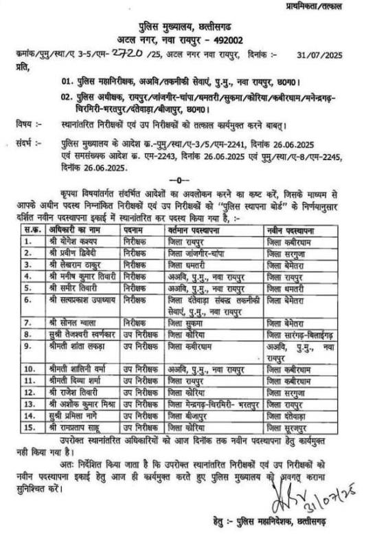 - कोरिया जिला से भी तीन उप निरीक्षकों का तबादला हुआ है अन्यत्र जिलों में, अभी तक नहीं हुए हैं कार्य मुक्त