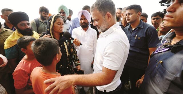 अमृतसर/गुरदासपुर,15 सितम्बर 2025 (ए)। कांग्रेस नेता राहुल गांधी पंजाब दौरे पर रहे। वह सुबह करीब साढ़े 9 बजे अमृतसर एयरपोर्ट पर पहुंचे,जिसके बाद वह घोनेवाल गांव रवाना हुए। यहां उन्होंने बाढ़ प्रभावित लोगों से मुलाकात की और डूबी फसलें व टूटे घर देखे। उन्होंने गुरुद्वारा बीड़ बाबा बुड्ढा साहिब में माथा भी टेका। इसके बाद वह गुरदासपुर के गुरचक्क गांव पहुंचे,जहां उन्होंने उस जगह का दौरा किया, जहां बांध टूटने से खेत और घर जलमग्न हो गए थे। उन्होंने किसानों से मुलाकात की और फिर ट्रैक्टर पर सवार होकर आधा किलोमीटर दूर खड़ी अपनी गाड़ी तक पहुंचे,जहां से वह पहले पैदल आए थे। इसके बाद उन्होंने दीनानगर में बाढ़ पीडि़तों से मुलाकात की। उन्हें पाकिस्तान बॉर्डर से सटे 7 गांवों में जाना था, लेकिन सुरक्षा कारणों से अधिकारियों ने उन्हें आगे न जाने की सलाह दी, जिसके बाद राहुल गांधी वापस चले गए। दोनों ही जिलों में राहुल ने मीडिया से कोई बात नहीं की। राहुल के साथ पंजाब कांग्रेस के प्रधान अमरिंदर सिंह राजा वडि़ंग, पंजाब कांग्रेस इंचार्ज भूपेश बघेल और विधानसभा में विपक्ष के नेता प्रताप सिंह बाजवा भी मौजूद रहे। पंजाब में बाढ़ से 23 जिलों के 2 हजार 97 गांव प्रभावित हुए हैं, और लगभग 1 लाख 91 हजार 926 हेक्टेयर में फसलें डूब गईं। 15 जिलों में 52 लोगों की मौत हो चुकी है। 6 दिन पहले प्रधानमंत्री नरेंद्र मोदी ने पंजाब का दौरा किया था और हालात को देखते हुए पंजाब को 1600 करोड़ रुपए देने का ऐलान किया था, जिसे पंजाब की मान सरकार ने नाकाफी बताया था।