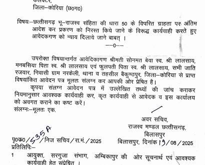कलेक्टर कोरिया तहसीलदार बैकुंठपुर की हुई है शिकायत,नियम विरुद्ध निर्णय खारिज करने की हुई है मांग
