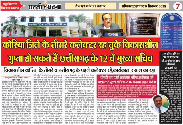 रायपुर,25 सितम्बर 2025 (घटती-घटना)। छत्तीसगढ़ के नए मुख्य सचिव का ऐलान, अमिताभ जैन के बाद छत्तीसगढ़ सरकार ने आईएएस विकास शील को राज्य का अगला मुख्य सचिव नियुक्त करने का फैसला किया है, वे वर्तमान मुख्य सचिव अमिताभ जैन की जगह लेंगे,जिनका कार्यकाल 30 सितंबर 2025 को समाप्त हो रहा है,छत्तीसगढ़ के नए प्रमुख सचिव का ऐलान हो गया है। अमिताभ जैन के बाद आईएएस विकासशील राज्य के प्रमुख सचिव का पदभार संभालेंगे। वर्तमान चीफ सेक्रेटरी यानी मुख्य सचिव अमिताभ जैन का कार्यकाल 30 सितंबर को खत्म हो रहा है, आईएएस विकासशील को केंद्र में प्रतिनियुक्ति से वापस लाया जाएगा,वो वर्ष 1994 बैच के छत्तीसगढ़ कैडर के आईएएस हैं। दैनिक घटती घटना ने इस खबर को 17 सितंबर को प्रकाशित कर इस बात का अंदेशा जताया था आखिर इस बात पर मोहर लग गई। छत्तीसगढ़ सरकार में नए मुख्य सचिव की एंट्री तय मानी जा रही है,छत्तीसगढ़ सरकार के 13 वें मुख्य सचिव की जिम्मेदारी कभी भी आईएएस विकासशील गुप्ता को दी जा सकती है और इसकी प्रारंभिक तैयारियों के पूर्ण कर लिए जाने की जानकारी प्राप्त हो रही है,विकासशील गुप्ता 1994 बैच के आईएएस हैं और वह मध्यप्रदेश कैडर के आईएएस हैं और वर्ष 2000 में छत्तीसगढ़ राज्य गठन के बाद वह छत्तीसगढ़ में अपनी सेवा प्रदान करने लगे,विकासशील गुप्ता छत्तीसगढ़ में कई जिलों के कलेक्टर रहे और जिसमे कोरिया,बिलासपुर और रायपुर में उन्होंने कलेक्टर बतौर सेवाएं प्रदान की,कोरिया जिले में उनका कार्यकाल सबसे लंबा रहा तीन वर्षों तक जिले के कलेक्टर रहे विकासशील गुप्ता की ही देखरेख और निगरानी में जिला संयुक्त कार्यालय का निर्माण,नए कलेक्टर आवास पुलिस अधीक्षक आवास का निर्माण झुमका क्षेत्र में किया गया ऐसा बताया जाता है,बड़े ही सौम्य और व्यवहारकुशल उन्हें कोरिया जिले के कलेक्टर रहते हुए माना जाता था और उन्होंने आम लोगों से मिलने जुलने में कभी पदीय महत्व को आड़े नहीं आने दिया था ऐसा बताया जाता है,उस समय के कुछ छात्र नेताओं के अनुसार वह छात्रों को भी शिक्षा के महत्व के साथ छात्र राजनीति की सीख दिया करते थे और शासकीय शिक्षा व्यवस्था को लेकर वह हमेशा सकारात्मक नजर आते थे। विकासशील गुप्ता उत्तर प्रदेश के निवासी थे बाद में वह उत्तराखंड में रहने लगे ऐसी उनकी पारिवारिक जानकारियां सामने हैं और वह आईएएस बनकर मध्यप्रदेश कैडर में शामिल हुए और सेवाएं प्रदान करनी आरंभ की,वर्तमान में वह मनीला स्थित एशियाई विकास बैंक से कार्यमुक्त होकर भारत लौट रहे हैं वहीं इसी हफ्ते सेंट्रल डेप्यूटेशन से रिलीव होकर वे छत्तीसगढ़ आ जाएंगे,वह पांच आईएएस अधिकारियों को पछाड़कर मुख्य सचिव बनने जा रहे हैं जो सरकार की तैयारी बताई जा रही है, मुख्य सचिव की दौड़ में 1991 बैच की आईएएस रे
