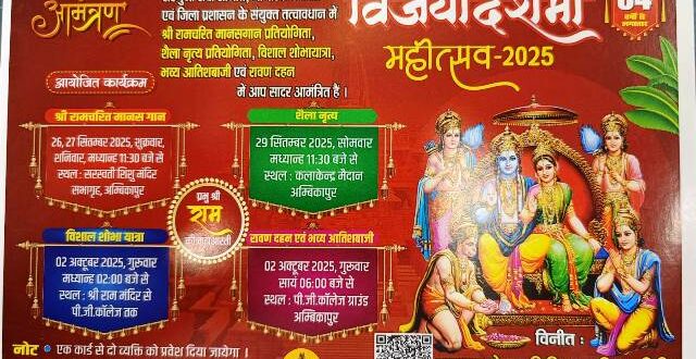 अंबिकापुर,25 सितम्बर 2025 (घटती-घटना)। सरगुजा सेवा समिति,नागरिक समिति एवं जिला प्रशासन के संयुक्त तत्वाधान में विगत 33 वर्षों से विजय दशमी महापर्व का आयोजन किया जा रहा है। जिसमे प्रतिवर्ष की भांति इस वर्ष भी आयोजन के 34 वें वर्ष में सरगुजा सेवा समिति,नागरिक समिति एवं जिला प्रशासन द्वारा विजय दशमी महापर्व की तैयारी जोरो शोरो से चल रही है। सरगुजा सेवा समिति के महासचिव श्री संजय अग्रवाल द्वारा बताया गया है कि इस वर्ष के कार्यक्रम का आयोजन हर वर्ष की भांति मानस गायन प्रतियोगिता से प्रारंभ होगा मानस गायन प्रतियोगिता का आयोजन कल दिनांक 26.09.2025 दिन गुरुवार को प्रातः 11ः00 बजे से स्थानीय सरस्वती शिशु मंदिर देवीगंज रोड के सभागार में भगवान श्री राम,जानकी एवं लक्ष्मण श्री हनुमान जी के विधिवत् पूजा अर्चना के साथ प्रारंभ की जायेगी। मानस गायन के प्रथम दिवस महिला मंडली द्वारा प्रतुति दी जायेगी एवं द्वितीय दिवस दिनांक 27.09.2025 दिन शनिवार को पुरूष मंडली प्रस्तुति दी जायेगी। सरगुजा संभागीय श्री राम चरित्र मानस गायन प्रतियोगिता में प्रथम पुरस्कार 10,000/-रू. द्वितीय पुरस्कार 7,000/- रू. एवं तृतीय पुरस्कार 5,000/- रू. विजेताओं को स्मृति चिन्ह के साथ पुरस्कृत की जायेगी। यह पुरस्कार महिला मंडली व पुरूष मंडली को अलग-अलग दी जायेगी एवं प्रतियोगिता में सम्मिलित प्रत्येक टीम को 1,100/- रू. प्रोत्साहन राशि प्रदान की जायेगी। समिति द्वारा हर वर्ष की भांति इस वर्ष भी सरगुजा संभाग स्तरीय लोक नृत्य प्रतियोगिता का भी आयोजन किया जा रहा है। लोक नृत्य प्रतियोगिता 29.09.2025 को स्थानीय कलाकेन्द्र मैदान में प्रातः 11ः00 बजे से प्रारंभ होगी कार्यक्रम में सुआ नृत्य व शैला नृत्य की प्रस्तुति प्रतिभागीयो द्वारा निश्चित समयावधि में दी जायेगी। लोक नृत्य प्रतियोगिता में प्रथम पुरस्कार 10,000/-रू. द्वितीय पुरस्कार 7,000/- रू. एवं तृतीय पुरस्कार 5,000/- रू. विजेताओं को स्मृति चिन्ह के साथ पुरस्कृत की जायेगी। यह पुरस्कार शैला नृत्य व सुआ नृत्य के प्रतिभागीयों को अलग-अलग दी जायेगी। एवं प्रतियोगिता में सम्मिलित प्रत्येक टीम को 1,500/- रू. प्रोत्साहन राशि प्रदान की जायेगी। विजय दशमी महापर्व 2025 का आयोजन दिनांक 02.010.2025 दिन गुरूवार को श्री राम मंदिर से दोपहर 02ः00 बजे शोभा यात्रा के साथ प्रारंभ होगा,यह शोभा यात्रा श्री राम मंदिर होते हुए जय स्तभं चौक,महामाया चौक, संगम चौक,घड़ी चौक,गांधी चौक होते हुए पी.जी. कॉलेज मैदान की ओर प्रस्थान करेगी। शोभा यात्रा का मुख्य आकर्षण श्री राम लला जी रथ के साथ झांकी,जबलपुर की झांकी,शैला नृत्य,सुआ नृत्य व धुमाल बैण्ड के साथ शोभा यात्रा को और भी भव्यता प्रदान करने का प्रयास समिति इस वर्ष कर रही है। विजयदशमी महापर्व 2025 का संध्या कार्यक्रम 05ः00 बजे