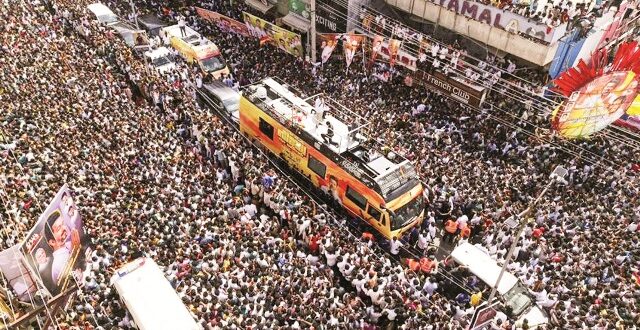 करूर,27 सितम्बर 2025 (ए)। तमिलनाडु के करूर में एक्टर विजय की रैली में शनिवार को भगदड़ मच गई। इसमें 36 लोगों की मौत हो गई। मरने वालों में 16 महिलाएं और 8 बच्चे शामिल हैं। तमिलनाडु के स्वास्थ्य मंत्री एम ए सुब्रमणियन ने यह जानकारी दी। हादसे में 58 से ज्यादा लोग घायल हो गए। आशंका जताई जा रही है कि मरने वालों की संख्या बढ़ सकती है। जानकारी के मुताबिक अभिनेता से नेता बने विजय की पार्टी तमिलगा वेट्री कजगम यानी टीवीके की रैली में बड़ी संख्या में लोग पहुंचे थे। बताया गया है कि 9 साल की एक बच्ची गुम गई थी। विजय ने मंच से उसे तलाशने की अपील पुलिस और अपने लोगों से की, जिसके बाद वहां भगदड़ जैसे हालात बन गए। भीड़ में फंसने से कई लोगों को सांस लेने में परेशानी हुई और कई लोग और कार्यकर्ता बेहोश होने लगे। हालात बिगड़ते देख विजय ने भाषण रोक दिया और लोगों से शांति की अपील की। इसके बाद वे भाषण छोड़कर निकल गए। विजय की रैली के लिए 10 हजार लोगों की परमिशन थी। प्रशासन को 50 हजार लोगों के जुटने का अनुमान था, लेकिन वहां करीब 1 लाख 20 हजार लोग एकत्र हो गए थे। तमिलनाडु के मुख्यमंत्री एमके स्टालिन ने कहा- मैं खुद करूर जाकर पीडि़त परिवारों से मिलूंगा। उन्हें सांत्वना दूंगा और अस्पतालों में इलाज करा रहे लोगों से भी मिलूंगा। उन्होंने बताया कि आज करूर में इस भीड़ हादसे में 36 लोग मारे गए, जिनमें 8 बच्चे और 16 महिलाएं शामिल हैं। यह खबर सुनकर मुझे बहुत दुख और सदमा पहुंचा। मुख्यमंत्री ने कहा कि अस्पताल में इलाज कर रहे सभी मरीजों को सबसे अच्छा इलाज मिले, इसके लिए मैंने विद्यालय शिक्षा मंत्री और स्वास्थ्य मंत्री को तुरंत करूर भेजा है। इसके साथ ही तिरुचिरापल्ली, सलेम और डिंडीगुल के जिला कलेक्टरों को भी मेडिकल टीमों के साथ मदद के लिए भेजा गया है। सीएम ने मृतकों के लिए 10 लाख रुपए के मुआवजे का ऐलान किया।