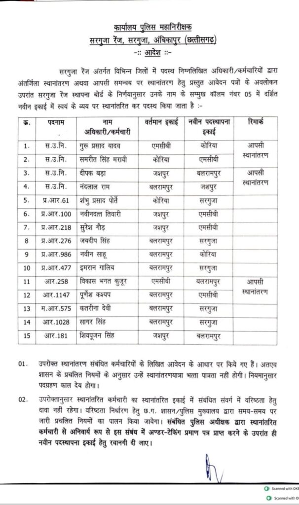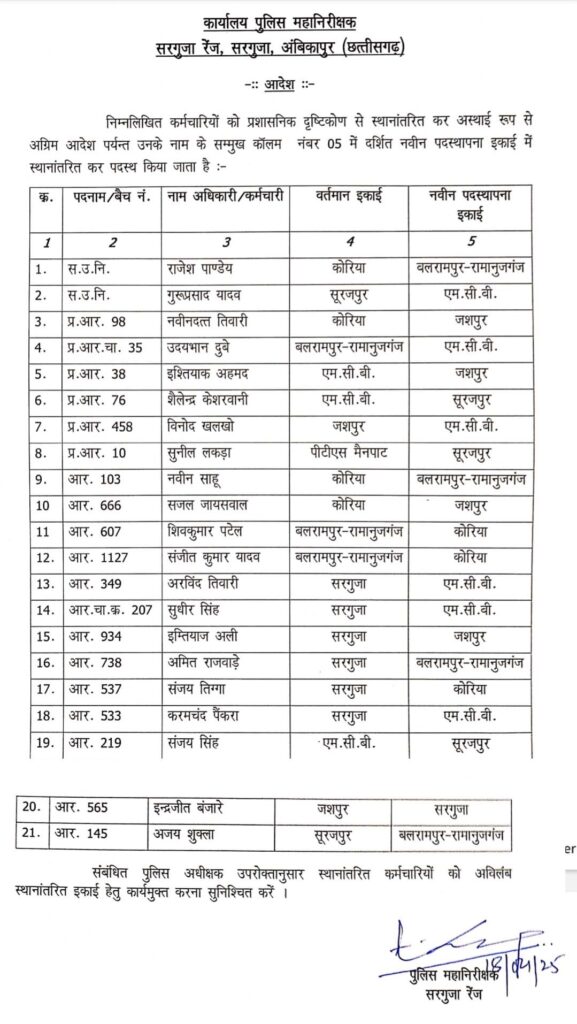 सरगुजा आईजी द्वारा जारी स्थानांतरण आदेश के बाद पुलिस विभाग की कार्यप्रणाली पर सवाल खड़े हो रहे हैं,जारी आदेश में ज्यादातर नाम ऐसे हैं जो पुलिस विभाग के सरगुजा संभाग के चर्चित नाम हैं जिस पर लगातार आरोप भी लगते रहे हैं। ऐसे पुलिसकर्मियों को इस आदेश में मनचाही पदस्थापना प्रदान की गई है,यह आदेश यह प्रश्न खड़ा करता है कि क्या दोषपूर्ण कार्यप्रणाली वाले पुलिसकर्मियों के सामने विभाग नतमस्तक है जिसके कारण विभाग को दोषपूर्ण कार्यप्रणाली वाले पुलिसकर्मियों को बार बार लाभ पहुंचाना पड़ता है उन्हें हमेशा प्रसन्न रखना पड़ता है। वैसे इस आदेश के बाद यह प्रश्न लगातार खड़ा हो रहा है और यह पुलिस की कार्यप्रणाली को ही कटघरे में खड़ा करता है।