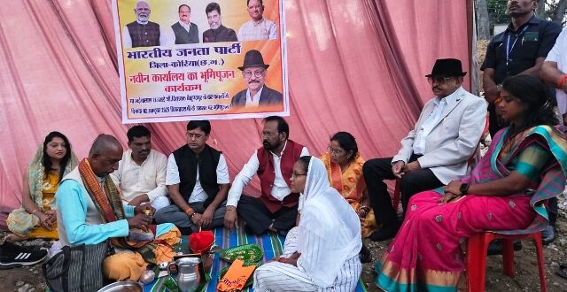 बैकुंठपुर,03 अक्टूबर 2025 (घटती-घटना)। भारतीय जनता पार्टी जिला कार्यालय बैकुंठपुर कोरिया का नवीन कार्यालय का भूमिपूजन विजयादशमी के शुभ अवसर पर मुख्य आतिथ्य विधायक भईयालाल राजवाड़े एवं भाजपा जिलाध्यक्ष देवेन्द्र तिवारी के अध्यक्षता मे किया गया। नवीन भाजपा जिला कार्यालय आधुनिक बनेगा, जिसमे सभाकक्ष, जिलाध्यक्ष, जिला पदाधिकारी कक्ष, मोर्चा-प्रकोष्ठ कक्ष, वीडियो कॉन्फ्रेंस हाल एवं अन्य सुविधाओं के साथ आकर्षक कार्यालय बनकर तैयार होगा। इस अवसर पर पूर्व जिलाध्यक्ष कृष्णबिहारी जायसवाल, पूर्व जिला उपाध्यक्ष शैलेष शिवहरे, जिला पंचायत अध्यक्ष मोहित पैकरा,जिला उपाध्यक्ष अशोक जायसवाल,अनिल साहू, रविशंकर राजवाड़े,जिला पंचायत सदस्य गीता राजवाड़े,जिला महामंत्री पंकज गुप्ता, कपिल जायसवाल,जिला मंत्री शारदा गुप्ता, जिला मीडिया प्रभारी तीरथ राजवाड़े,जिला कार्यालय मंत्री मंजू जिवनानी, सहित पार्टी कार्यकर्ता उपस्थित थे।
