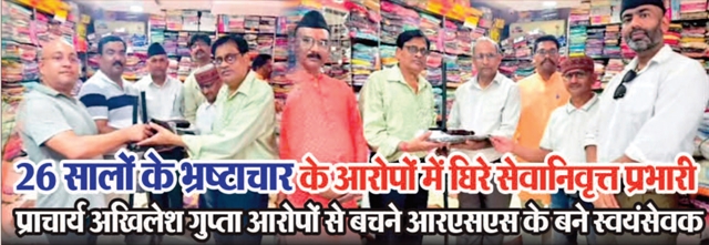 बैकुंठपुर,04 अक्टूबर 2025 (घटती-घटना)। क्या भ्रष्टाचार के आरोपों से घिरे शासकीय रामानुज प्रताप सिंहदेव महाविद्यालय बैकुंठपुर के सेवानिवृत्त प्रभारी प्राचार्य भ्रष्टाचार के आरोपों से बचने के लिए आरएसएस की शरण में जा पहुंचे हैं और वह आरएसएस को ढाल बनाकर अब खुद पर लगे भ्रष्टाचार के आरोपों से बचने के फिराक में हैं, ऐसा सवाल इसलिए खड़ा हो रहा है क्योंकि अखिलेश चंद्र गुप्ता हाल फिलहाल में आरएसएस की शाखाओं में जाते नजर आ रहे हैं और वह आरएसएस के निर्धारित परिधान खरीदते भी तस्वीरों में कैद हुए हैं।