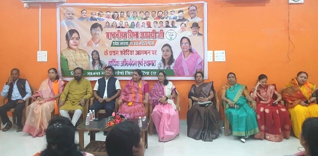 बैकुंठपुर, 06 अक्टूबर 2025 (घटती-घटना)। भाजपा महिला मोर्चा छत्तीसगढ़ प्रदेश के अध्यक्ष श्रीमती विभा अवस्थी के प्रथम कोरिया आगमन पर ढोल-नगाड़ा, करमा नृत्य व आतिशबाजी, फूल-मालाओं से भव्य स्वागत किया गया। इस अवसर पर भाजपा जिलाध्यक्ष देवेन्द्र तिवारी, पूर्व जिलाध्यक्ष कृष्णबिहारी जायसवाल,जिला उपाध्यक्ष रविशंकर राजवाड़े,चुन्नी पैकरा, जिला महामंत्री पंकज गुप्ता, जिला पंचायत उपाध्यक्ष वंदना राजवाड़े, जिला मंत्री शारदा गुप्ता,जिला मीडिया प्रभारी तीरथ राजवाड़े, महिला मोर्चा जिला प्रभारी प्रवीण सिंह,प्रभारी अनिता तिवारी,महिला मोर्चा जिलाध्यक्ष धर्मवती राजवाड़े,नगर पालिका अध्यक्ष नविता शिवहरे, नगर पंचायत अध्यक्ष गायत्री सिंह, जिला पंचायत सदस्य गीता राजवाड़े मौजूद रहें।