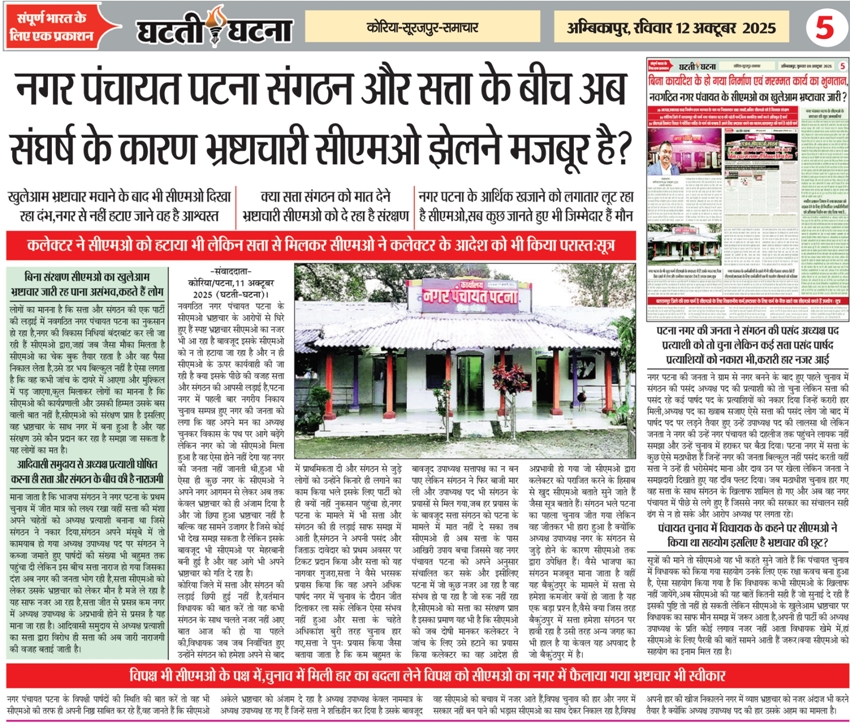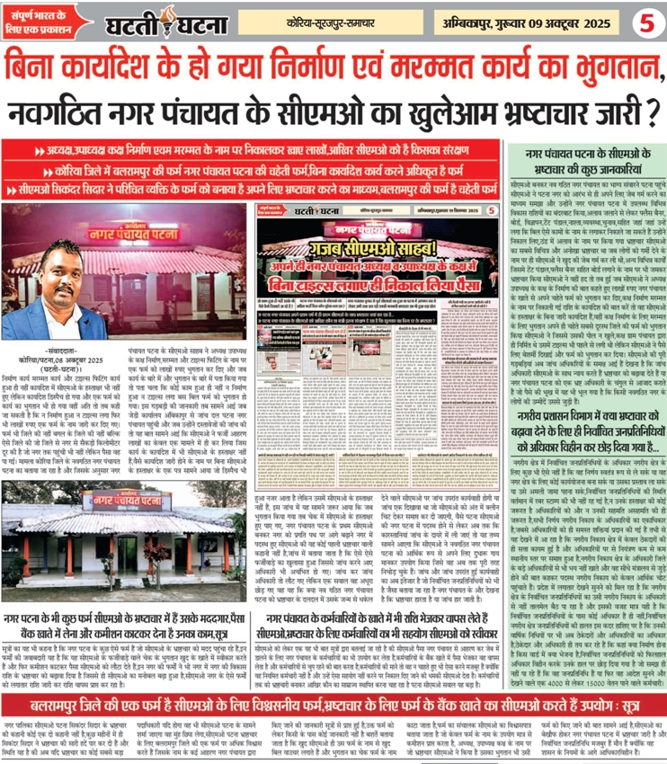 - कोरिया जिले के नवगठित नगर पंचायत पटना में कोरिया कलेक्टर कैसे मिटा सकेंगी भ्रष्टाचार,सीएमओ भ्रष्टाचार के लिए हैं विख्यात?