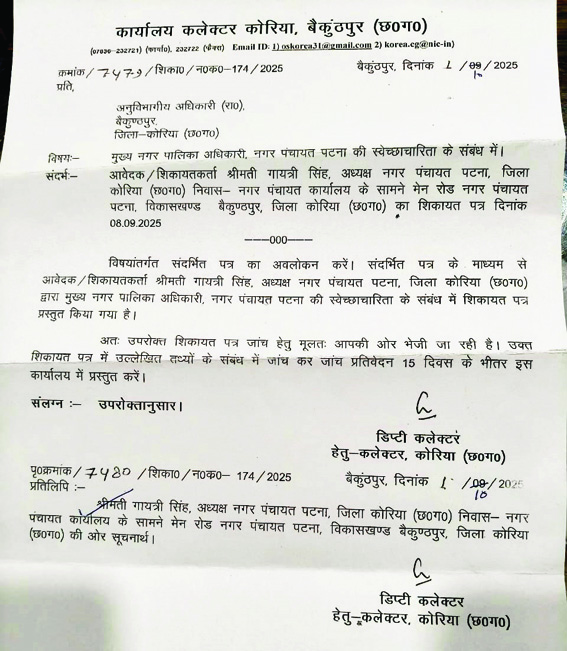 कलेक्टर कोरिया ने सीएमओ नगर पंचायत पटना के विरुद्ध प्राप्त शिकायत की जांच के लिए एसडीएम बैकुंठपुर को जांच अधिकारी नियुक्त करते हुए 15 दिवस में जांच रिपोर्ट प्रस्तुत करने का आदेश जारी किया था,आदेश जारी होने के बाद अब 23 दिन बीत गए,न जांच हुई न ही एसडीएम पटना नगर पंचायत जांच करने पहुंचे,अब एसडीएम ने क्यों जांच नहीं की,कलेक्टर कोरिया द्वारा तय जांच के लिए समय सीमा का भी एसडीएम ने क्यों ध्यान नहीं रखा बड़ा सवाल है।