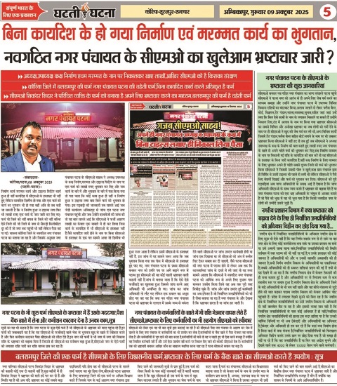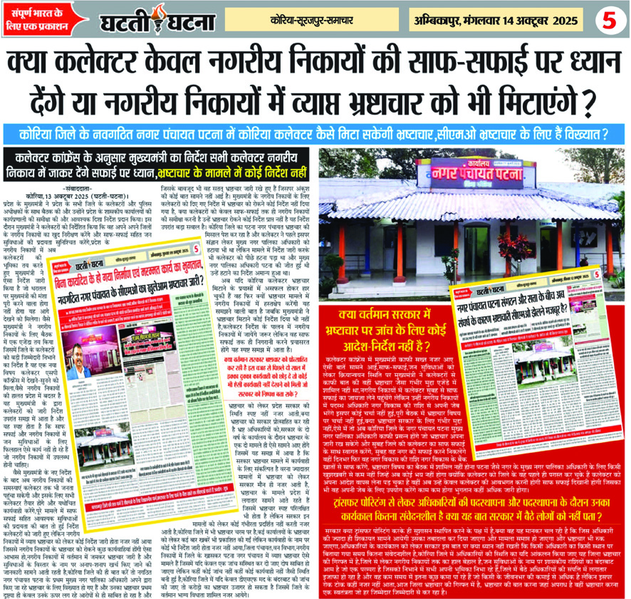 नव गठित नगर पंचायत पटना में मुख्य नगर पालिका अधिकारी (सीएमओ) पर भ्रष्टाचार के कई आरोप लगे थे। जांच में भ्रष्टाचार साबित हुआ,लेकिन उसके खिलाफ कोई कार्रवाई नहीं हुई। अब वह पुनः नगर पंचायत लौट आया और अपने भ्रष्टाचार के सबूत मिटाने का प्रयास कर रहा है। जांच उपरांत सीएमओ के भ्रष्टाचार की तथ्यात्मक पुष्टि हो चुकी थी,जिसमें मृत मवेशियों के दफन,अलाव निर्माण और टाइल्स का पैसा अपने खाता में डालना शामिल है। इसके बावजूद कार्रवाई शून्य रही। ज्ञात हो की नव गठित नगर पंचायत पटना में उसके गठन से लेकर अब तक भ्रष्टाचार करने वाले नगर विकास निधियों का बंदरबाट करने वाले मुख्य नगर पालिका अधिकारी के भ्रष्टाचार की जांच हुई जांच में भ्रष्टाचार साबित भी हुआ लेकिन उसके ऊपर कोई कार्यवाही नहीं हुई और वह पुनः पटना लौट आया और वह अब अपने भ्रष्टाचार को मिटाने का प्रयास जारी कर चुका है जैसी सूचनाएं प्राप्त हो रही हैं,जांच उपरांत वह भी नगरीय प्रशासन संभागीय संयुक्त संचालक स्तरीय में मुख्य नगर पालिका अधिकारी की चोरी पकड़ी गई लेकिन उसके ऊपर कार्यवाही के नाम पर कोई भी बात सामने नहीं आई,अब इसके पीछे किसका हांथ है कौन एक भ्रष्ट और विकास विरोधी मुख्य नगर पालिका अधिकारी का ऐसा हितैषी है जो उसे संरक्षण प्रदान कर रहा है जिसके लिए नव गठित नगर पंचायत पटना की जनता से भी अधिक महत्वपूर्ण है मुख्य नगर पालिका अधिकारी पटना,क्या मुख्य नगर पालिका अधिकारी नगर की जनता से भी अधिक चहेता हो गया उसे संरक्षण प्रदान करने वाले के लिए,ऐसे कई सवाल खड़े हो रहे हैं और जिनका जवाब किसी के पास नहीं है,मुख्य नगर पालिका अधिकारी ने बिना निर्माण किए निर्माण का भुगतना कर दिया,बिना टाइल्स लगाए टाइल्स का पैसा जेब में डाल लिए,एक जेसीबी फर्म के साथ मिलकर मृत मवेशियों के कफ़न दफन का झूठा पैसा निकाल लिया और इतना ही नहीं झूठा अलाव जलाया लोगों की ठंड दूर करने की बजाए अपनी जेब गर्म किया,दैनिक वेतन भोगी कुछ कर्मचारियों को भी चोरी में शामिल किया उनके बैंक खाते में नगर विकास निधि का पैसा डाला और उन्हें कमीशन देकर उसे भी अपनी जेब में डाल लिया और बेखौफ होकर नगर को लूटने का काम करता रहा,वैसे जांच उपरांत जो तथ्य जांच में सामने आए वह भ्रष्टाचार को साबित कर गए लेकिन कार्यवाही कुछ नहीं हुई बल्कि मुख्य नगर पालिका अधिकारी कुछ दिन इधर उधर मुंह छिपाकर जुगाड लगाकर पुनः लौट आया और वह अब अपने भ्रष्टाचार के सबूत मिटाने में भीड़ चुका है,वैसे स्पष्ट रूप से भ्रष्टाचार की सच्चाई सामने आने के बाद भी कोई कार्यवाही नहीं किया जाना यह संदेह उत्पन्न करता है कि किसी न किसी का संरक्षण मुख्य नगर पालिका अधिकारी को प्राप्त है जो उसे नगर को दुर्दशा की स्थिति तक पहुंचाने में मदद कर रहा 