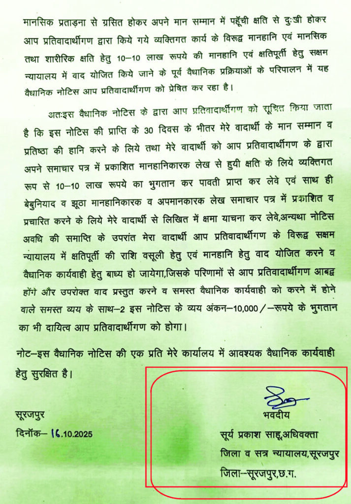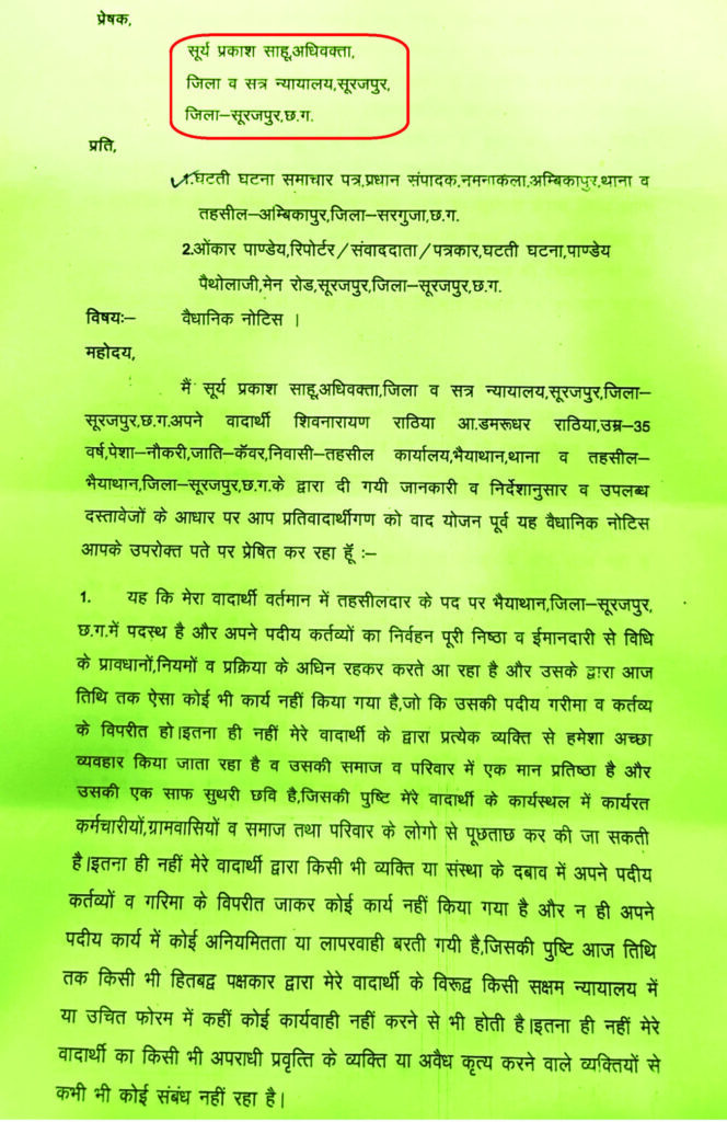 अंबिकापुर/सूरजपुर,26 सितम्बर 2025 (घटती-घटना)। तहसीलदार शिवनारायण राठिया के अधिवक्ता ने घटती-घटना के पत्रकार को वैधानिक नोटिस भेजा,लेकिन नोटिस में अधिवक्ता का पूरा पता और कार्यालय का विवरण नहीं दिया गया है। केवल सूरजपुर जिला न्यायालय का पता दिया गया है,जो वैध नोटिस के लिए पर्याप्त नहीं है। कानून के जानकारों के अनुसार,अधिवक्ता अधिनियम,1961 के तहत नोटिस में पूरा नाम,पंजीकरण संख्या और कार्यालय/निवास का पता होना अनिवार्य है। अधिवक्ता द्वारा केवल न्यायालय का पता देना नियमों का उल्लंघन है। वैसे सवाल यह है कि क्या अधिवक्ता हड़बड़ी में थे।