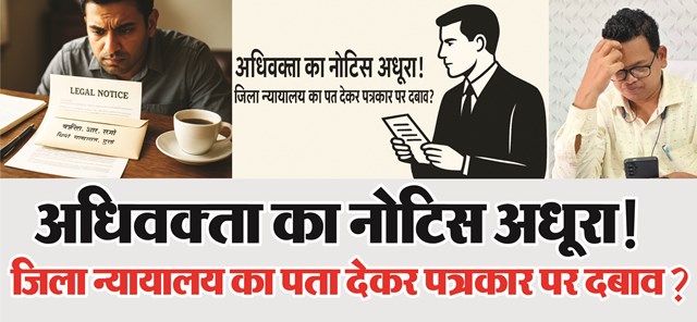 कानूनी रूप से वैध नोटिस में अधिवक्ता का पूरा विवरण होना अनिवार्य होता है। अधूरा नोटिस पत्रकार पर दबाव डालने की कोशिश या हड़बड़ी का परिणाम ही माना जा सकता है।