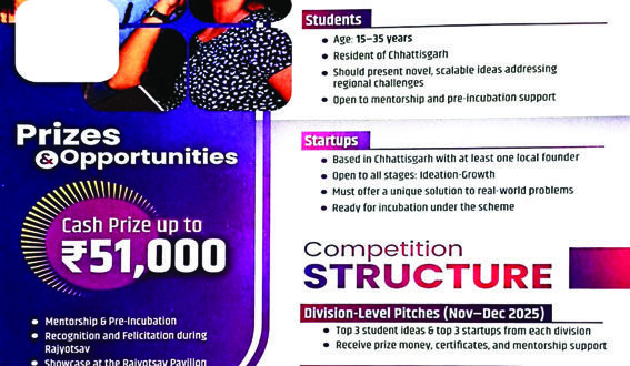 रजत जयंती वर्ष-2025 के उपलक्ष्य में उद्योग विभाग के अंतर्गत स्टार्टअप छत्तीसगढ़ द्वारा नवाचार और उद्यमिता को प्रोत्साहित करने हेतु छत्तीसगढ़ आइडियाथॉन-2025 स्टार्टअप पिचेस एवं अवॉर्ड्स इवेंट का शुभारंभ किया गया है। इस आयोजन का मुख्य उद्देश्य प्रदेश के महाविद्यालयों, आईटीआई, लाइवलीहुड कॉलेजों, संकाय सदस्यों, नवाचार क्लबों, अनुसंधान एवं विकास केन्द्रों, संस्थागत इनक्यूबेटरों तथा स्किल सेंटरों के विद्यार्थियों और नवप्रवर्तकों को एक सशक्त प्लेटफॉर्म प्रदान करना है, ताकि वे अपने अभिनव विचारों को वास्तविक स्वरूप दे सकें। राज्यव्यापी स्तर पर आयोजित होने वाले इस छत्तीसगढ़ आइडियाथॉन-2025 में कुल 10 संभावनाशील विचारों और 10 अभिनव स्टार्टअप्स का चयन किया जाएगा। चयनित प्रतिभागियों को राज्योत्सव में आयोजित डेमो डे-पिचिंग इवेंट में अपनी अंतिम प्रस्तुति देने का अवसर मिलेगा। मूल्यांकन के आधार पर शीर्ष 5 छात्र विचारों एवं शीर्ष 5 स्टार्टअप्स को सम्मानित किया जाएगा। विजेताओं को 51,000 रुपए तक का नकद पुरस्कार दिया जाएगा। आगे के विकास के लिए मेन्टॉरशिप, राज्योत्सव मंच पर सम्मान और राज्योत्सव प्रदर्शनी मंडप में अपने उत्पादों/सेवाओं के प्रदर्शन का सुनहरा अवसर प्राप्त होगा। ऑनलाइन पंजीकरण हेतु पोर्टल पर 29 अक्टूबर 2025 तक आवेदन किया जा सकता है। स्टार्टअप छत्तीसगढ़ का यह अभिनव प्रयास राज्य के युवाओं में नवाचार, उद्यमिता और समावेशी भागीदारी को सशक्त बनाने की दिशा में एक ऐतिहासिक पहल सिद्ध होगा, जो छत्तीसगढ़ को आत्मनिर्भर और नवाचारमय राज्य बनाने की ओर अग्रसर करेगा।