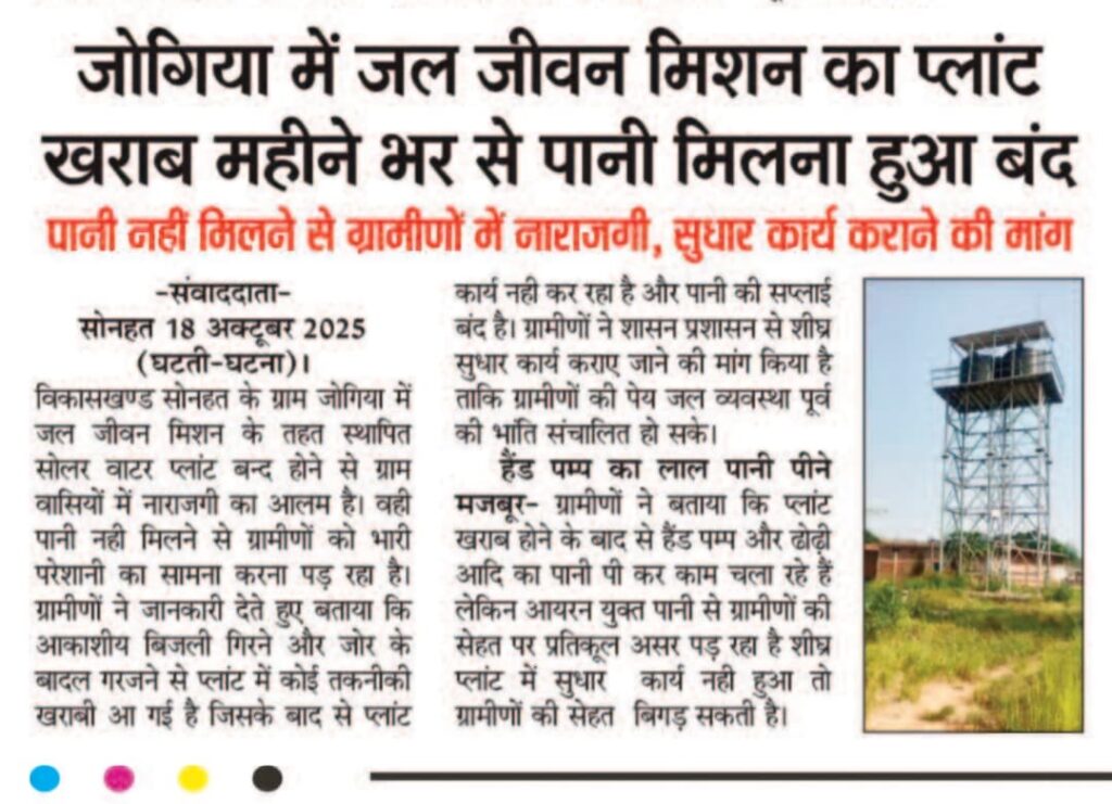 जोगिया के ग्रामीणों ने बताया कि जोगिया के जल जीवन मिशन सोलर वाटर प्लांट में खराबी आने के बाद भारी समस्या हो रही थी,घटती घटना में खबर प्रकाशित होने के बाद पम्प निकाल कर मरम्मत के लिए भेज दिया गया है,जिससे जल्द फिर से पानी मिलने की उम्मीद जग गई है।