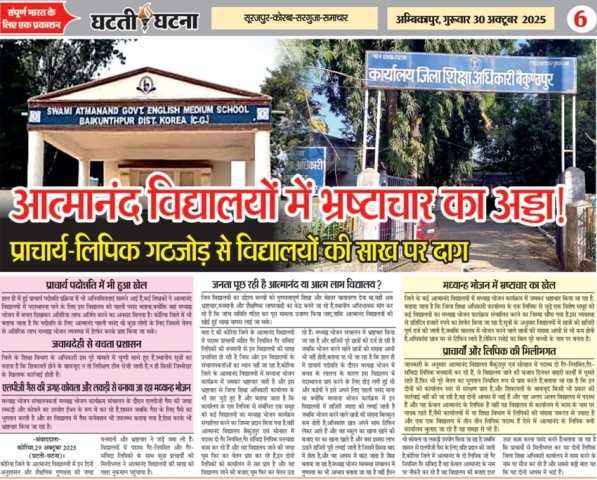 कोरिया,01 नवंबर 2025 (घटती-घटना)। दैनिक घटती-घटना में प्रकाशित आत्मानंद विद्यालयों में गड़बड़ी की खबर से शिक्षा विभाग में हड़कंप मच गया,जिला शिक्षा अधिकारी कार्यालय से लेकर विद्यालय प्रबंधन तक हरकत में आ गया,खबर छपते ही आनन-फानन में सुधार का दिखावा किया गया कहीं गैस सिलेंडर पहुंचा तो कहीं बिना आदेश जांच के नाम पर लीपापोती शुरू हो गई।