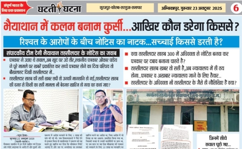 सूरजपुर/भैयाथान,02 नवंबर 2025 (घटती-घटना)। भैयाथान तहसील में रिश्वत के आरोपों से जुड़े गंभीर मामले को 50 दिन से अधिक समय बीत चुका है,शिकायतकर्ता सौरभ प्रताप सिंह द्वारा दिए गए ऑडियो, वीडियो और लिखित सबूत,बार-बार वायरल हो चुके हैं,फिर भी तहसील और जिला प्रशासन की शंकित चुप्पी कई सवाल खड़े कर रही है जब सबूत जनता के सामने हैज्तब कार्रवाई न्याय कक्ष में क्यों नहीं पहुंच रही? शिकायतकर्ता ने बताया कि तत्कालीन तहसीलदार संजय राठौर ने सरकारी कार्य के बदले रिश्वत की मांग की थी। सबूत जमा होने के बाद भी,न निलंबन,न जांच,न एफआईआर सब कुछ रुका हुआ सा लगता है, शुरुआत एक शिकायत और पत्रकार पर नोटिस भैयाथान तहसील से शुरू हुआ यह मामला अब जिले के पूरे प्रशासनिक तंत्र पर सवाल खड़ा कर रहा है,शिकायतकर्ता सौरभ प्रताप सिंह ने जनदर्शन में आवेदन देकर पूर्व तहसीलदार संजय राठौर और उनके नगर सैनिक संजय मिश्रा पर रिश्वत मांगने का आरोप लगाया था,आवेदन में कहा गया कि 1 लाख रुपये और एक आई पैड की मांग की गई थी,जब शिकायतकर्ता ने रिश्वत देने से इनकार किया,तो प्रकरण को निराधार बताकर खारिज कर दिया गया,यह लिखते हुए कि सीमांकन रिपोर्ट में हस्ताक्षर नहीं हैं,हालांकि,दस्तावेज़ बताते हैं कि आरआई लक्ष्मी खलखो की रिपोर्ट में सभी हस्ताक्षर मौजूद थे और कब्जे की स्थिति स्पष्ट थी। प्रशासन चाहता तो पुनः रिपोर्ट मंगाई जा सकती थी परंतु ऐसा नहीं किया गया,इसके बाद जब एक स्थानीय पत्रकार ने इस पूरे मामले की रिपोर्ट प्रकाशित की,तो इसके जवाब में तहसीलदार शिव नारायण राठिया की ओर से पत्रकार को मानहानि का नोटिस भेजा गया जिससे यह सवाल उठ गया कि क्या यह सच को दबाने की कोशिश थी? मामले की पूरी टाइमलाइन जनता याद रखे इसलिए दर्ज तारीख क्या हुआ? शुरुआत 2023 जमीन सीमा विवाद पर अर्जी आरआई लक्ष्मी खलखो की जांच कब्जे का पूरा ब्यौरा,विरोधी पक्ष के हस्ताक्षर तहसील कार्यालय में रिश्वत माँगी गई 1,00,000 माँगने का आरोप पैसे देने से इनकार,दबाव आदेश ग़लत कारण दिखाकर खारिज साइन नहीं,रिपोर्ट अस्पष्ट में शिकायत पर पत्रकार ने रिपोर्ट छापी जनता में सवाल अब तक कार्रवाई शून्य सबूत दमदार थे फिर भी आदेश दबा क्यों?