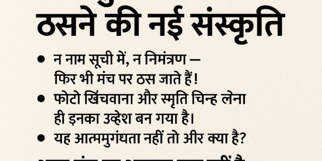 अब असली परेशानी होती है आयोजकों को क्योंकि स्वागत-सत्कार, नाश्ता-पानी और मोमेंटो की व्यवस्था आमंत्रित अतिथियों के अनुसार ही होती है। पर ये अनौपचारिक अतिथि सबसे आगे बैठकर न केवल बुके की प्रतीक्षा करते हैं, बल्कि स्मृति चिन्ह की मांग तक कर डालते हैं,फोटो सेशन में मुख्य भूमिका निभाना और बाद में सोशल मीडिया पर फलां कार्यक्रम में अतिथि बतौर शामिल हुआ जैसी पोस्ट डालना इनका प्रिय कर्म है,ऐसे स्वघोषित विशिष्ट जन समाज में सम्मान नहीं, बल्कि उपहास अर्जित करते हैं, यह आत्ममुग्धता नहीं तो और क्या है कि बिना किसी योगदान या निमंत्रण के व्यक्ति स्वयं को हीरो सिद्ध करने पर आमादा हो जाए,मंच की गरिमा तब बनती है जब वह आमंत्रित अतिथियों के सम्मान से सुसज्जित हो, न कि जब वह आत्मप्रचार के शिकार लोगों से भर जाए। इस प्रवृत्ति को रोकने का पहला कदम है — आत्मसंयम। जब मंच पर आपका नाम नहीं है, तो वहीं नीचे दीर्घा में बैठकर ताली बजाना कहीं अधिक गरिमामय है, कभी-कभी नीचे बैठ जाना ही व्यक्ति को ऊँचा बना देता है, और जब मंच पर जबरन ठसना व्यक्ति को छोटा कर देता है — सपरिवार याद किया जाता है,पर अच्छे शब्दों में नहीं।