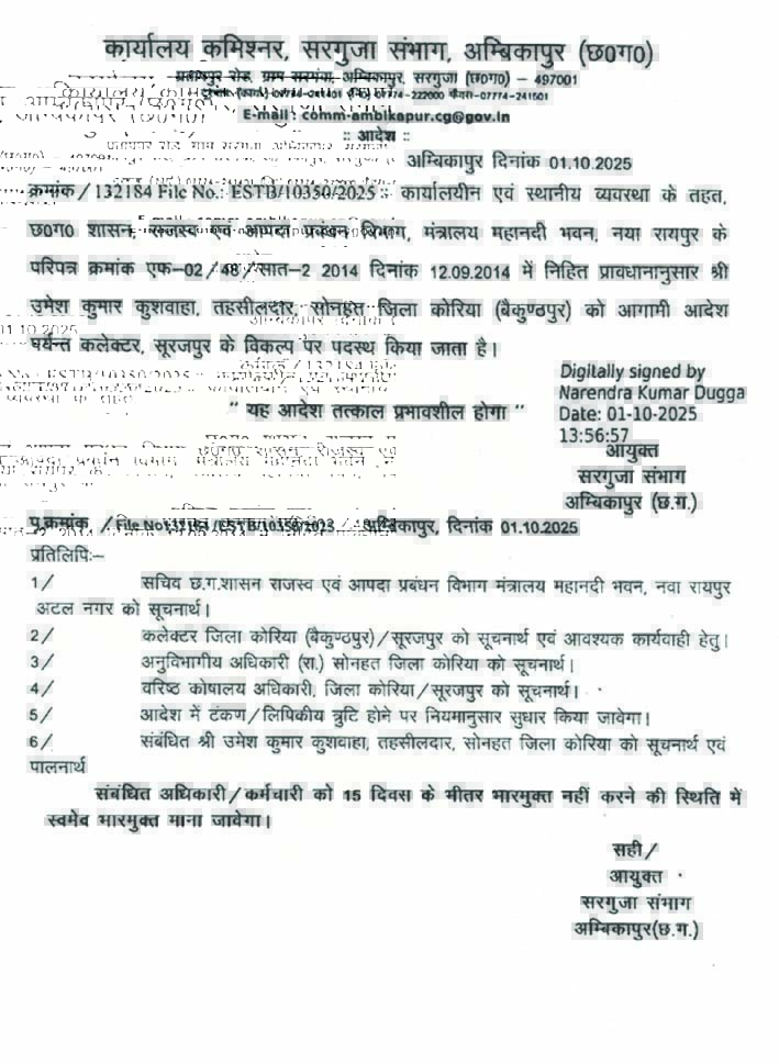 क्या सोनहत के तहसीलदार का तबादला कमिश्नर की ‘पसंद’ का परिणाम?