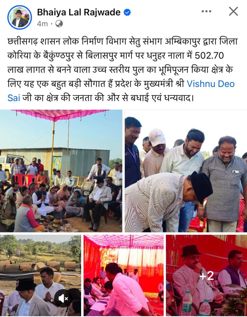 बैकुंठपुर-बिलासपुर मार्ग के ग्राम मनसुख स्थित धनुहर नाले पर पिछले एक माह से पुल निर्माण का कार्य जारी है। इस पुल के लिए राज्य सरकार ने 502.70 लाख रुपये की राशि स्वीकृत कर दी है। लेकिन शुक्रवार को विधायक भैयालाल रजवाड़े ने उसी स्थल पर फिर से भूमिपूजन कर सभी को चौंका दिया,स्थानीय लोगों और जानकारों का कहना है कि भूमिपूजन सदैव कार्य आरंभ से पहले किया जाता है, कार्य शुरू होने के बाद नहीं। ऐसे में विधायक का यह कदम श्रेय लेने की होड़ के रूप में देखा जा रहा है।