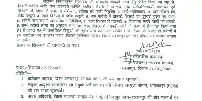 जानकारी के अनुसार बलरामपुर आदिम जाति सेवा सहकारी समिति सेवारी के प्रबंधक मुकुंद राम पर फर्जी नियुक्ति,भाई-भतीजावाद, धान टोकन और खाद वितरण में अवैध वसूली एवं किसानों के तौलाई-बोरा भराई राशि गबन के साथ साथ अमर्यादित गतिविधियों के गंभीर आरोप लगे हैं। जानकारी के अनुसार प्रबंधक पर यह भी आरोप है कि शिकायत करने वाले किसानों को अब भी धमकाया जा रहा है,जबकि उनके करीबी संविदा कर्मचारी के द्वारा पहाड़ी कोरवा एवं किसानों के साथ दुर्व्यवहार और शोषण किया जा रहा है। खबर यह है कि इन सभी आरोपों को लेकर सैकड़ों किसानों और दर्जनों जनप्रतिनिधियों ने 18 अगस्त को बलरामपुर कलेक्टर के नाम हस्ताक्षरित ज्ञापन सौंपा था। जिसपर बलरामपुर कलेक्टर ने सहकारिता विभाग को जांच के निर्देश दिए थे। सहकारिता सहायक के द्वारा 21 अगस्त को जांच का आदेश जारी किया था। सहकारिता सहायक आयुक्त ने 21 अगस्त को ए.के. दास, सहकारिता विस्तार अधिकारी वाड्रफनगर को तीन दिवस के भीतर जांच कर प्रतिवेदन प्रस्तुत करने का निर्देश दिया था। लेकिन ढाई माह बीत जाने के बाद भी जांच पूरी नहीं हो सकी है, जिससे किसानों में नाराजगी बढ़ती जा रही है। इस संबंध में सहकारिता सहायक आयुक्त सुरेश पैकरा ने बताया कि जांच प्रक्रिया अंतिम चरण में है और शीघ्र ही प्रतिवेदन कलेक्टर के समक्ष प्रस्तुत किया जाएगा।
