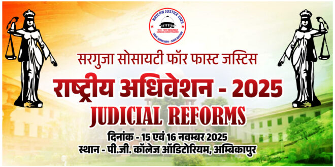 न्याय व्यवस्था में सुधार,तथा तत्काल न्याय दिलाने और न्यायालय में जो कमियां है उसे दूर करने हेतु फोरम फॉर फास्ट जस्टिस संस्था के द्वारा कार्य किया जाता हैं उक्त संस्था का पुर देश में सदस्य अलग अलग जिलों और राज्य में न्यायपालिका में सुधार के लिए कार्य कर रहे है,इन्हीं सब तथ्यों को रखने के लिए फोरम फॉर फास्ट जस्टिस संस्था का प्रत्येक वर्ष राष्ट्रीय अधिवेशन होता हैं जिसमें देश के अलग अलग राज्यों से प्रतिनिधि शामिल होते हैं, इस बार राष्ट्रीय अधिवेशन करने की जिम्मेदारी सरगुजा सोसाइटी फॉर फास्ट जस्टिस को दी गई है , जिसके तथ्य पीजी कॉलेज आटोडोरियम अंबिकापुर में दिनांक 15,16नवंबर को होना है दिनांक 15दिन शनिवार को सुबह 10बजे मल्टीपरपस स्कूल से रेली के रूप में कार्यक्रम की शुरुआत होगी और रैली का समापन पीजी कॉलेज आटोडोरियम में होगा, उसके बाद सेमिनार का आयोजन किया जाएगा जिसमें देश के अलग अलग राज्यों से आए अतिथिओं का उद्बोधन होगा। उक्त कार्यक्रम में आम जनता,सामाजिक कार्यकर्ता, अधिवक्ता तथा सभी वर्ग के लोग शामिल होगे,आप सभी से अपील है कि उक्त कार्यकर्म में आवश्यक रूप से शामिल हो।