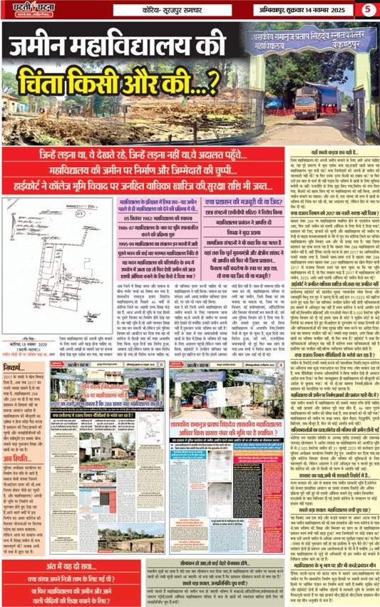महाविद्यालय की जमीन बचाई जा सकती थी पर बचाई नहीं गई,जिन्हें अदालत जाना था,वे चुप रहे,और जिन्हें चुप रहना था,वे अदालत पहुँचे,लेकिन असफल रहे, छात्रों के भविष्य की रक्षा के लिए की गई जनहित याचिका भी खारिज कर दी गई और जमानत राशि तक जब्त कर ली गई, अग्रणी रामानुज प्रताप सिंहदेव महाविद्यालय की 46 वर्ष पुरानी जमीन पर अब पुलिस अधीक्षक कार्यालय का निर्माण जारी है,महाविद्यालय से एनओसी नहीं ली गई, विरोध को दरकिनार कर दिया गया, और 2017 का नजरी नक्शा,जिसमें खसरा क्रमांक 288 व 289 को स्पष्ट रूप से महाविद्यालय क्षेत्र बताया गया है उसे भी अनदेखा कर दिया गया,दैनिक घटती-घटना ने महीनों तक इस मुद्दे को शहर का सबसे महत्वपूर्ण जनहित प्रश्न मानकर कवरेज की दस्तावेज पेश किए,प्रमाण दिखाए, विरोध को आवाज दी लेकिन प्रशासन की जिद और महाविद्यालय प्रबंधन की चुप्पी के आगे पत्रकारिता भी आखिरकार असफल साबित हुई, आज प्रशासन,राजनीति और व्यवस्था—तीनों ने अपना रुख बदलने से मना कर दिया है, इसीलिए यह खबर महाविद्यालय भूमि विवाद की अंतिम खबर मानी जा रही है।