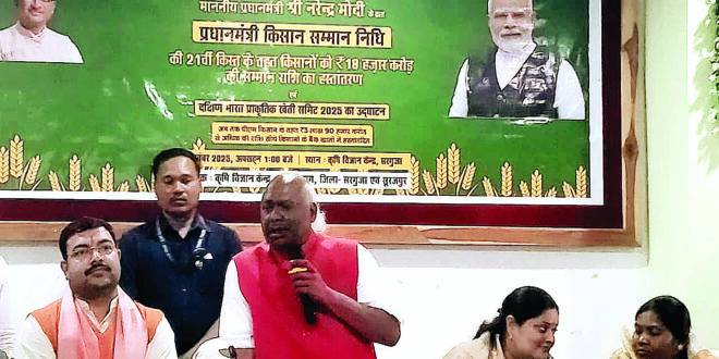 जिला स्तरीय कार्यक्रम कृषि विज्ञान केंद्र अजिरमा अम्बिकापुर में सांसद श्री चिंतामणी महाराज के मुख्य आतिथ्य में आयोजित किया गया। इस कार्यक्रम में जिले के कृषको को प्रधानमंत्री किसान सम्मान निधि योजना की 21 वी कि¸स्त की राशि हस्तांतरित की गई। जिसमें जिले के पी एम किसान पंजीकृत पात्र 100215 कृषको को 20.04 करोड़ रुपये। सीधे कृषको के बैंक खाते में अंतरण किया गया। जिससे जिले के कृषको में खुशीओ से चेहरे में चमक आ गई है सुश्री संपदा पैकरा उपसंचालक कृषि सूरजपुर की मार्गदर्शन में जिला स्तरीय कार्यक्रम कृषि विज्ञान केंद्र अजिरमा अम्बिकापुर में आयोजित किया गया जिसमें जिले के 105 कृषक शामिल होकर कार्यक्रम को सफल बनाकर श्री नरेंद्र मोदी के परिचर्चा आनन्द लिये साथ ही विकासखण्ड स्तर एव ग्राम स्तर में भी कार्यक्रम का आयोजन किया गया। जिसमें जिले के लगभग 1000 कृषको द्वारा कार्यक्रम का आनन्द लिये। इस कार्यक्रम में संदीप शर्मा कार्यक्रम समन्वयक के वी के अजिरमा, श्री संदीप सिन्हा सहायक संचालक कृषि ,धीरेंद्र कुशवाहा कृषि विकास अधिकारी अभिषेक सिंह ग्रामीण कृषि विस्तार अधिकारी रजनी पैकरा मोनू ठाकुर एव कृषको का विशेष सहयोग रहा।