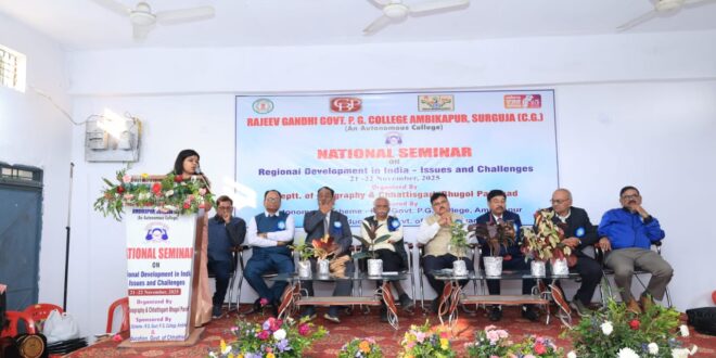 पीजी कॉलेज में 21 और 22 नवंबर को भूगोल विभाग एवं छत्तीसगढ़ भूगोल परिषद के संयुक्त तत्वावधान में ‘क्षेत्रीय विकास मुद्दे एवं चुनौतियां’ विषय पर राष्ट्रीय शोध संगोष्ठी का आयोजन किया गया। संगोष्ठी में छत्तीसगढ़ के अलावा मध्य प्रदेश, उत्तर प्रदेश, दिल्ली, झारखंड, मिजोरम और बिहार से शोधकर्ता और प्राध्यापक सम्मिलित हुए। कुल 250 से अधिक भूगोल प्राध्यापकों, शोधकर्ताओं और स्नातकोत्तर छात्रों ने रजिस्ट्रेशन कराया। संगोष्ठी में 173 शोध पत्रों के एब्स्ट्रेक्ट का प्रकाशन हुआ और आठ तकनीकी सत्रों में 32 शोध पत्रों का वाचन किया गया। इस संगोष्ठी की एक प्रमुख विशेषता यह थी कि इसमें 35 वर्ष से कम उम्र के शोध छात्रों के लिए एक प्रतियोगिता आयोजित की गई, जिसमें 8 छात्रों ने भाग लिया। यंग ज्योग्राफर अवार्ड के तहत तीन छात्रों को प्रथम, द्वितीय और तृतीय पुरस्कार से सम्मानित किया गया। पुरस्कार प्राप्त छात्र थे – अजीत कुमार शांते, शमलेश पोटाई और असुंता खलखो। खास बात यह थी कि भूगोल विभाग के विभागाध्यक्ष डॉ. अनिल सिन्हा और उनकी पत्नी उमा सिन्हा ने अपने स्वर्गीय माता-पिता की स्मृति में इन छात्रों को नकद राशि से सम्मानित किया। संगोष्ठी में स्नातकोत्तर छात्रों के लिए ‘सस्टेनेबल डेवलपमेंट’ और ‘नगरीय विकास’ पर पोस्टर प्रतियोगिता भी आयोजित की गई, जिसमें 17 छात्रों ने भाग लिया। तीन श्रेष्ठ पोस्टर को प्रमाण पत्र प्रदान किए गए। समापन सत्र में मुख्य अतिथि प्रोफेसर टी. एल. वर्मा ने ‘विकसित भारत 2047’ के संदर्भ में विकास के सामाजिक, आर्थिक, भौगोलिक और राजनीतिक पहलुओं पर अपने विचार व्यक्त किए। विशिष्ट अतिथि डॉ. एसपी त्रिपाठी ने संसाधनों के उपयोग और संरक्षण की महत्ता पर प्रकाश डाला। मिजोरम केंद्रीय विश्वविद्यालय के प्रोफेसर वी. पी. सती ने अनुसंधान की सूक्ष्म पद्धतियों पर व्याख्यान दिया। संगोष्ठी की सफलता पर दीपिका स्वर्णकार ने महाविद्यालय परिवार और प्रतिभागियों का धन्यवाद ज्ञापित किया। संगोष्ठी का आयोजन छत्तीसगढ़ शासन उच्च शिक्षा विभाग के सहयोग से हुआ था।