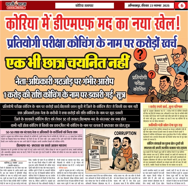 जिले के डीएमएफ मद में प्रतियोगी परीक्षा कोचिंग के नाम पर करोड़ों की भारी बंदरबांट का सनसनीख़ेज़ आरोप सामने आया है। सबसे बड़ा सवाल यह जब पीएससी अंतिम चयन सूची में कोरिया जिले के कोचिंग सेंटरों से एक भी अभ्यर्थी चयनित नहीं हुआ, तो फिर करोड़ों खर्च कहां गए? किसकी जेब में पहुंचे? और किस ‘कारनामे’ को उपलब्धि बताकर जनता को गुमराह किया जा रहा है? सरकारी दावे बनाम कड़वी हकीकत आदिवासी विकास विभाग द्वारा संचालित एचीवर्स आईसीएस और मंत्रा ट्यूटोरियल नामक कोचिंग संस्थानों पर डीएमएफ राशि से 1 करोड़ से अधिक खर्च करने का आरोप है। सरकारी प्रेस नोट में दावा किया गया कि विगत दो वर्षों में 30 विद्यार्थी सफल हुए, कलेक्टर से सौजन्य मुलाकात की लेकिन वास्तविक पीएससी चयन सूची में कोरिया जिले की इस सरकारी कोचिंग से एक भी नाम नहीं, जबकि डीएमएफ मद की रकम हर साल बढ़ती गई। यही तस्वीर अब सबसे बड़ा सवाल बन चुकी है—जो फोटो ‘सफलता’ का प्रमाण बताई जा रही थी, क्या वह सिर्फ पीआर स्टंट था?- सूत्रों के अनुसार आरोप एक नोडल अधिकारी और एक प्रभावशाली नेता के बेहद करीबी व्यक्ति पर आरोप है कि उन्होंने कोचिंग के नाम पर बड़ी कटौती की, अभ्यर्थियों को पढ़ाने के नाम पर कम गुणवत्ता वाली क्लासें, सफलता के नाम पर बिना साक्ष्य के आंकड़े,और परिणाम—शून्य चयन!
