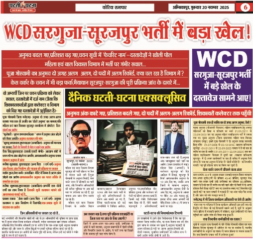 सूरजपुर/एमसीबी,27 नवम्बर 2025 (दैनिक घटती-घटना)। महिला एवं बाल विकास विभाग की भर्तियों में जिला बाल संरक्षण इकाई, मिशन वात्सल्य, चाइल्ड हेल्पलाइन 1098,केस वर्कर, सुपरवाइजर और अन्य संवेदनशील पदों पर जारी चयन सूचियों ने एमसीबी और सूरजपुर दोनों जिलों में बड़ा विवाद खड़ा कर दिया है, सबसे चौंकाने वाली बात दोनों जिलों की शिकायतों में एक ही अधिकारी का नाम उठने से चयन प्रक्रिया की विश्वसनीयता पर बड़ा सवाल,महिला एवं बाल विकास विभाग की संविदा भर्ती में पहले एमसीबी जिले में गड़बड़ी की शिकायतें,और अब सूरजपुर में सूची को लेकर बड़ा विवाद इन दोनों जगहों पर एक ही अधिकारी की तैनाती ने पूरी प्रक्रिया की निष्पक्षता पर तीखा सवाल खड़ा कर दिया है, यह आरोप अभ्यर्थियों और स्थानीय संगठनों की ओर से उठे हैं दो जिलों में दो अलग भर्तियाँ, लेकिन गड़बड़ी का पैटर्न एक जैसा क्या यह सिर्फ इत्तेफ़ाक है? एमसीबी जिले में संचालित नवा बिहाना योजना अंतर्गत सखी वन स्टॉप सेंटर,महिला सशक्तिकरण केंद्र,चाइल्ड हेल्पलाइन,मिशन वात्सल्य बाल संरक्षण इकाई, किशोर न्याय बोर्ड एवं बाल कल्याण समिति सहित कई महत्वपूर्ण संवेदनशील विभागों में भर्ती घोटाले का आरोप सामने आया है,पूर्व विधायक गुलाब कमरो ने कलेक्टर को पत्र लिखकर 28 चयनित नामों की सूची,पदनाम व संस्थाओं के साथ सौंपते हुए कहा कि इन नियुक्तियों में बड़े पैमाने पर भ्रष्टाचार,फर्जी अनुभव प्रमाण-पत्र और पसंदीदा आवेदकों को नियम तोड़कर पद दिए गए हैं, घटती-घटना इन आरोपों की स्वतंत्र पुष्टि नहीं करता।