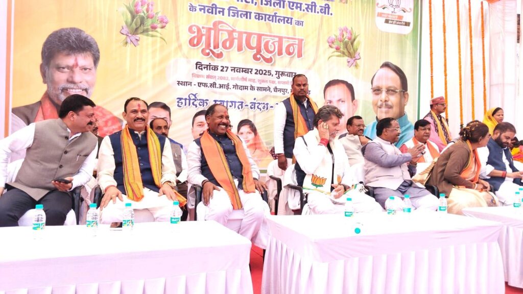 एमसीबी,27 नवंबर 2025 (घटती-घटना)। भारतीय जनता पार्टी जिला मनेंद्रगढ़-चिरमिरी-भरतपुर के नवीन जिला कार्यालय के भव्य भूमिपूजन कार्यक्रम ने आज ऐतिहासिक माहौल बना दिया, एफसीआई गोदाम के सामने चैनपुर,मनेंद्रगढ़ में आयोजित समारोह में प्रदेश अध्यक्ष किरण देव सिंह, संगठन मंत्री,प्रदेश कोषाध्यक्ष राम गर्ग,मंत्री रामविचार नेताम, स्वास्थ्य मंत्री श्याम बिहारी जायसवाल,प्रदेश मंत्री अखिलेश सोनी,सांसद रेणुका सिंह,भरतपुर-सोनहत विधायक तथा जिलाध्यक्ष श्रीमती चंपा देवी पावले सहित भारी संख्या में भाजपा पदाधिकारी, कार्यकर्ता एवं समर्थक मौजूद रहे, कार्यक्रम स्थल पर उमड़ी भीड़ और कार्यकर्ताओं का जोश देखते ही बनता था।