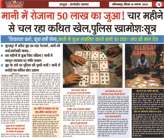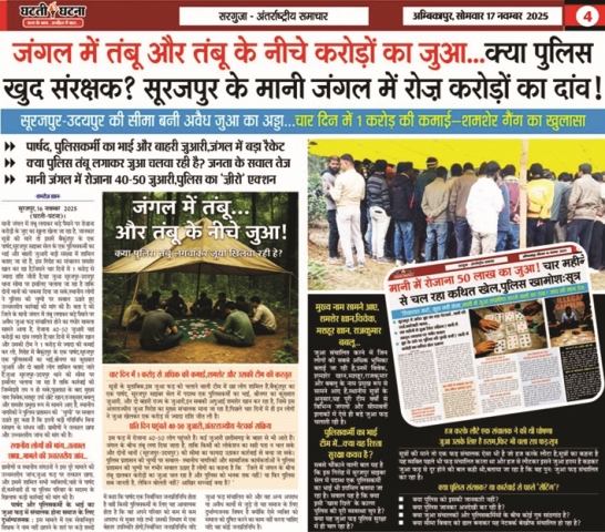 सूरजपुर,28 नवम्बर 2025 (घटती-घटना)। हज बदला…दिल नहीं…जंगल बदला…जुआ नहीं…पुलिस बदली… संरक्षण नहीं, दैनिक घटती-घटना ने पहले भी मानी-उदयपुर बॉर्डर के जंगल में चल रहे करोड़ों के जुआ तंबू को उजागर किया था,उस खबर के बाद तंबू जरूर उखड़ा…लेकिन जुआ का खेल बंद नहीं हुआ, सिर्फ स्थान बदल गया है,अब जुआरी रामकोला के खोड़ जंगल में नया अड्डा बसाए बैठे हैं,और हैरानी की बात यह है कि इसके पीछे फिर वही पुराने चेहरे, वही सेटिंग और वही संरक्षण का खेल सामने आ रहा है, जिले में अवैध जुआ नेटवर्क का सिरमौर माना जाने वाला शमशेर खान, हज यात्रा से लौटने के बाद यह जताता रहा कि उसने जुआ खेलना छोड़ दिया है…लेकिन जमीनी सच बिल्कुल उलटा है, दैनिक घटती-घटना की इन्वेस्टिगेशन में जो तथ्य सामने आए हैं, वे पूरे जिले के लिए चौंकाने वाले और हिला देने वाले हैं।