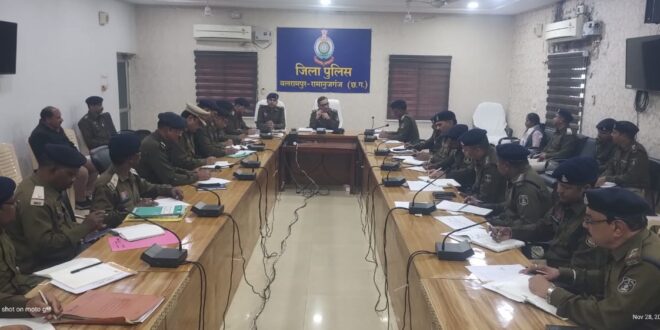 प्रभारी पुलिस अधीक्षक ने समीक्षा बैठक के दौरान पुराने लंबित प्रकरणों के विवेचको को फटकार लगाते हुए कहा कि लंबित प्रकरणों के निराकरण की समय सीमा निर्धारित कर जल्द से जल्द निराकरण करने कहा गया। जानकारी के अनुसार दिनांक 28/11/ 2025, दिन शुक्रवार को प्रभारी पुलिस अधीक्षक बलरामपुर मनोज कुमार खिलारी (भापुसे) द्वारा पुलिस अधीक्षक कार्यालय बलरामपुर के सभागार कक्ष में जिले के समस्त राजपत्रित अधिकारियों, थाना चौकी प्रभारी की अपराध समीक्षा बैठक ली गई। समीक्षा के दौरान प्रभारी पुलिस अधीक्षक द्वारा समस्त थाना/चौकी प्रभारी से थाना/चौकीवार लंबित अपराध, लंबित मर्ग, लंबित चालान,लंबित शिकायत की प्रत्येक प्रकारणवार विस्तृत समीक्षा की गई। पुलिस अधीक्षक द्वारा प्रत्येक थाना चौकी प्रभारी से उनके थाने में लंबित मामलों का बारी-बारी से पूछताछ कर अत्यधिक दिनों से लंबित प्रकरणों में थाना प्रभारी/विवेचक को फटकार लगाते हुए समय सीमा निर्धारित कर शीघ्र प्रकरणों का निराकरण करने निर्देशित किया गया।