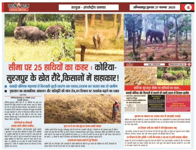कोरिया-सूरजपुर सीमा एक बार फिर जंगली हाथियों के आतंक से दहल उठी है। मौसम की मार झेल रहे किसानों पर अब हाथियों का कहर दोहरी चोट बनकर टूट पड़ा है। 25 हाथियों का बड़ा दल बीते तीन दिनों से कछाड़ी-जोगिया-मझगवां (कोरिया) से लेकर किरवाही-घुइडी-छतरंग (सूरजपुर) तक गांव-दर-गांव घूमते हुए धान की फसल रौंधता जा रहा है। बता दे की छत्तीसगढ़ में मौसम की मार झेल रहे किसानों पर जंगली हाथियों के आतंक ने जख्म पर नमक छिड़कने का काम किया है, क्षेत्र में सक्रिय 25 हाथीयो के दल अलग-अलग हिस्सों में स्वतंत्र विचरण कर रहे हैं और खेतों में किसानों की खड़ी फसल को रौंध कर तबाह कर रहे हैं, मझगवां कछाड़ी जोगिया और सूरजपुर के छतरँग किरवाही में उत्पात मचाने के बाद हाथियों का एक बड़ा दल राष्ट्रीय उद्यान से कोरिया मण्डल के तरफ आया और राष्ट्रीय उद्यान से लगे ग्राम मेण्ड्रा में किसानों की फसल को व्यापक स्तर पर नुकसान पहुचाया की मेण्ड्रा से लगे खेतों के बड़े रकबे में लगी किसानों की धान की खड़ी फसल को रौंध कर चौपट कर दिया, ग्रामीणों ने बताया कि क्षेत्र के गांव में हाथियों का एक बड़ा दल विचरण कर रहा है जिसने यहां किसानों के रातों की नींद उड़ा दी है।