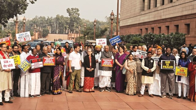 संसद के शीतकालीन सत्र के दूसरे दिन कार्यवाही शुरू होने से पहले कांग्रेस की अगुवाई में इंडी गठबंधन के नेताओं ने मतदाता सूची के विशेष गहन पुनरीक्षण (एसआईआर) के खिलाफ विरोध प्रदर्शन किया। संसद भवन के बाहर हुए इस प्रदर्शन में कांग्रेस अध्यक्ष मल्लिकार्जुन खरगे, कांग्रेस संसदीय दल की अध्यक्ष सोनिया गांधी, लोकसभा में नेता प्रतिपक्ष राहुल गांधी, कांग्रेस महासचिव प्रियंका गांधी, महासचिव केसी वेणुगोपाल, लोकसभा में कांग्रेस के उपनेता गौरव गोगोई, प्रमोद तिवारी सहित कई दलों के वरिष्ठ नेता मौजूद रहे। नेताओं ने कतारबद्ध होकर हाथों में पोस्टर और बैनर लेकर प्रदर्शन किया। पोस्टरों पर ‘दलितों, पिछड़ों और आदिवासियों के वोट खत्म करने के लिए नहीं हैं’, ‘एसआईआर खत्म करो, वोट चोरी बंद करो’, ‘एसआईआर रोको, लोकतंत्र बचाओ’, ‘एसआईआर लोकतंत्र के खिलाफ अपराध है’ जैसे नारे लिखे थे। प्रदर्शनकारियों ने ‘एसआईआर बंद करो’ के नारे भी लगाए। कांग्रेस और इंडी गठबंधन एसआईआर शुरू होने के बाद से ही चुनाव आयोग और सत्ताधारी पार्टी भाजपा पर हमलावर है। इन पार्टियों का आरोप है कि एसआईआर के माध्यम से उनके कोर वोटर्स के वोट को काटा जा रहा है।