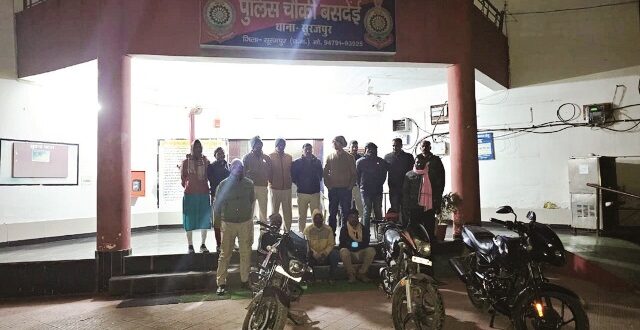 सूरजपुर,03 दिसम्बर 2025 (घटती-घटना)। डीआईजी व एसएसपी श्री प्रशांत कुमार ठाकुर के निर्देश पर जिले की पुलिस अवैध कार्यो के विरूद्ध लगातार कार्यवाही करने में लगी हुई है। इसी बीच दिनांक 02.12.2025 को चौकी बसदेई पुलिस को मुखबीर से सूचना मिला कि ग्राम गंगोटी में कुछ जुआडि़यान हारजीत का दाव लगाकर जुआ खेल रहे है। चौकी बसदेई पुलिस प्राप्त सूचना के आधार पर ग्राम गंगोटी में घेराबंदी कर 4 जुआड़ी जगदीश प्रसाद पिता रामनारायण साहू उम्र 48 वर्ष ग्राम पोड़ी थाना रामानुजनगर, पूरन प्रसाद पिता धनराज उम्र 35 वर्ष ग्राम गंगोटी चौकी बसदेई, संजय साहू पिता परन राम उम्र 43 वर्ष ग्राम मांजा थाना रामानुजनगर,सूरज साहू पिता राम संजीवन उम्र 32 वर्ष ग्राम बांसापारा चौकी बसदेई को जुआ खेलते रंगे हाथों धर दबोचा,जुआडि़यों के पास व जुआ फड़ से 9100 रूपये जप्त किया गया। मौके से जुआडि़यों के 4 नग मोबाईल व 4 नग मोटर सायकल कीमती 299100 रूपये का भी जप्त किया गया है। मामले में छत्तीसगढ़ जुआ प्रतिषेध अधिनियम 2022 की धारा 3(2) के तहत कार्यवाही कर आरोपियों को गिरफ्तार किया है।