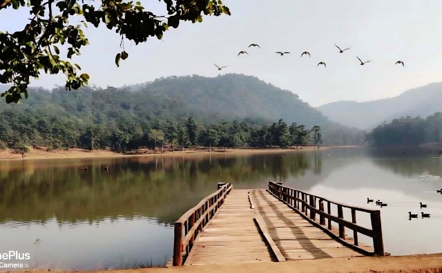 (लकड़ी का ब्रिज व उड़ते पक्षी )-“पहाड़ों के बीच बसे टेडिया डेम पर उड़ान भरते प्रवासी पक्षियों का मनोहारी दृश्य — राष्ट्रीय उद्यान क्षेत्र में प्रकृति का संतुलन लौटने का संकेत।”
