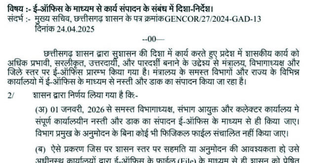 रायपुर, 12 दिसंबर 2025 I छत्तीसगढ़ सरकार ने ई-ऑफिस के माध्यम से काम करने के लिए सभी विभागों, संभागायुक्त और सभी कलेक्टरों को दिशा निर्देश जारी किया है। बता दें कि सुशासन की दिशा में काम करते हुए सरकार ने प्रदेश में शासकीय कार्य को अधिक प्रभावी, सरलीकृत, उत्तरदायी और पारदर्शी बनाने के उद्देश्य से मंत्रालय,विभागाध्यक्ष और जिले स्तर पर ई-ऑफिस प्रारंभ किया है। मंत्रालय के सभी विभागों और राज्य के विभिन्न कार्यालयों में ई-ऑफिस के माध्यम से नस्ती और डाक का संपादन किया जा रहा है। एक जनवरी 2026 से सभी विभागाध्यक्ष, संभाग आयुक्त और कलेक्टर कार्यालय में संपूर्ण कार्यालयीन नस्ती और डाक का संपादन ई-ऑफिस के माध्यम से ही किया जाए। विभाग प्रमुख के अनुमोदन के बिना कोई भी फिजिकल फाइल संचालित नहीं किया जाए। ऐसे प्रकरण जिस पर शासन स्तर पर सहमति या अनुमोदन की आवश्यकता हो उसे अधीनस्थ कार्यालयों द्वारा ई-ऑफिस के फाइल के माध्यम से ही शासन को प्रेषित किया जाए। सूचनात्मक पत्राचार ई-ऑफिस के रिसीप्ट के माध्यम से किया जाए। अधिकारियों द्वारा शासकीय प्रवास के दौरान मुख्यालय से अन्यत्र भी ई-ऑफिस के माध्यम से कार्य संपादित किया जाए। सार्वजनिक अवकाश अवधि में शासकीय सेवक ई-ऑफिस के माध्यम आवश्यकतानुसार कार्य संपादित कर सकते हैं।