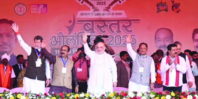 रायपुर,13 दिसम्बर 2025। केन्द्रीय गृह एवं सहकारिता मंत्री अमित शाह ने छत्तीसगढ़ के जगदलपुर में बस्तर ओलिंपिक के समापन समारोह को संबोधित किया। इस अवसर पर छत्तीसगढ़ के मुख्यमंत्री विष्णुदेव साय और उपमुख्यमंत्री विजय शर्मा सहित अनेक गणमान्य व्यक्ति उपस्थित थे। इस अवसर पर केन्द्रीय गृह एवं सहकारिता मंत्री अमित शाह ने कहा कि हमने तय किया था कि 31 मार्च, 2026 से पहले पूरे देश से लाल आतंक को खत्म कर देंगे और आज बस्तर ओलंपिक- 2025 में हम इस कगार पर खड़े हैं। उन्होंने कहा कि अगले वर्ष नवंबर-दिसंबर तक बस्तर ओलंपिक-2026 के समय तक पूरे भारत और छत्तीसगढ़ से लाल आतंक समाप्त हो चुका होगा औऱ नक्सलमुक्त बस्तर आगे बढ़ रहा होगा। अमित शाह ने कहा कि प्रधानमंत्री नरेन्द्र मोदी जी के नेतृत्व में हमने यह संकल्प लिया है कि पूरे बस्तर और भारत को नक्सलमुक्त कराना है। उन्होंने कहा कि हमें यहीं नहीं रुकना बल्कि कांकेर,कोंडागांव,बस्तर,सुकमा,बीजापुर, नारायणपुर और दंतेवाड़ा के 7 जि़लों का संभाग बस्तर, दिसंबर 2030 दिसंबर तक देश के सबसे अधिक विकसित आदिवासी संभाग बनेगा। उन्होंने कहा कि बस्तर के हर व्यक्ति को रहने के लिए घर, बिजली, शौचालय, नल से पीने का पानी, गैस सिलिंडर, 5 किलो अनाज और 5 लाख तक का मुफ्त इलाज, बस्तर के घर घर में पहुचाने का संकल्प हमारी सरकार का संकल्प है। शाह ने कहा कि हमने अगले पांच साल में बस्तर को देश का सबसे विकसित आदिवासी संभाग बनाने का संकल्प लिया है। उन्होंने कहा कि इसमें प्रधानमंत्री मोदी जी के नेतृत्व में भारत सरकार और विष्णुदेव साय जी के नेतृत्व में छत्तीसगढ़ सरकार कंधे से कंधा मिलाकर बस्तर को विकसित बस्तर बनाने के लिए मिलकर आगे बढ़ेंगे। केन्द्रीय गृह मंत्री ने कहा कि बस्तर का हर गांव सड़क से जुड़ेगा, वहां बिजली होगी, 5 किलोमीटर के क्षेत्र में बैंकिंग सुविधाएं होंगी और सबसे घने पीएचसी/सीएचसी का नेटवर्क बनाने का काम भी हमारी सरकार करेगी। उन्होंने कहा कि छत्तीसगढ़ में वन उपज की प्रोसेसिंग के लिए कोऑपरेटिव आधार पर यूनिट्स लगाए जाएंगे। उन्होंने कहा कि बस्तर के सातों जि़ले सभी आदिवासी जि़लों में सबसे अधिक दूध उत्पादन कर डेयरी के माध्यम से अपनी आय बढ़ाने वाले जि़ले बनेंगे। उन्होंने कहा कि बस्तर में नए उद्योग, उच्च शिक्षा की व्यवस्था, भारत में सबसे अच्छा स्पोर्ट्स संकुल और अत्याधुनिक अस्पताल की व्यवस्था भी हम करेंगे। शाह ने कहा कि कुपोषण के लिए भी यहां विशेष स्कीम चलाई जाएगी।