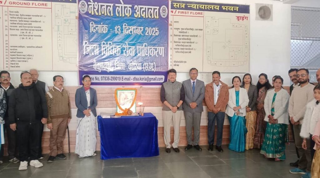 कोरिया,13 दिसंबर 2025 (घटती-घटना)। जिला विधिक सेवा प्राधिकरण, बैकुंठपुर (जिला-कोरिया) के तत्वावधान में 13 दिसंबर 2025, शनिवार को आयोजित नेशनल लोक अदालत ने न्यायिक इतिहास में एक महत्वपूर्ण उपलब्धि दर्ज की। इस एक दिवसीय लोक अदालत में कुल 12,680 प्रकरणों का निराकरण कर हजारों पक्षकारों को वर्षों से लंबित मामलों से राहत दिलाई गई, यह आयोजन राष्ट्रीय विधिक सेवा प्राधिकरण एवं छत्तीसगढ़ राज्य विधिक सेवा प्राधिकरण के निर्देशानुसार किया गया।प्रधान जिला न्यायाधीश के नेतृत्व में व्यापक आयोजन