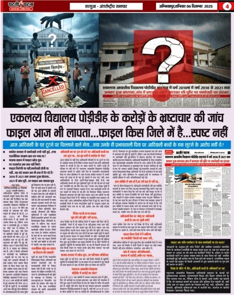 कोरिया,18 दिसंबर 2025 (घटती-घटना)। एकलव्य आदर्श संयुक्त आवासीय विद्यालय पोड़ीडीह,विकासखंड खडगवां, जिला कोरिया छत्तीसगढ़ में वर्ष 2017-18 से 2021-22 तक शासकीय धन के उपयोग में गंभीर अनियमितताओं का सिलसिला सामने आया है, यह खुलासा किसी आरोप या बयान पर नहीं,बल्कि आधिकारिक जांच प्रतिवेदन,नाम-वार पदस्थापना सूची,बिल-वाउचर,पंजी,भौतिक सत्यापन रिपोर्ट और अधिकारियों के स्वयं के लिखित बयानों के आधार पर हुआ है,जांच से यह स्पष्ट होता है कि पाँच वर्षों में करोड़ों रुपये का व्यय हुआ,लेकिन उसी अनुपात में न तो सामग्री मौके पर मिली,न ही शासन द्वारा निर्धारित प्रक्रिया का पालन किया गया।