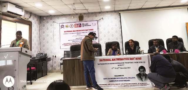 अम्बिकापुर,21 दिसम्बर 2025 (घटती-घटना)।शासकीय राजमोहिनी देवी कन्या स्नातकोत्तर महाविद्यालय अम्बिकापुर में छत्तीसगढ़ विज्ञान एवं प्रौद्योगिकी परिषद एवं राष्ट्रीय विज्ञान एवं प्रोद्योगिकी संचार परिषद भारत सरकार के सौजन्य से श्रीनिवास रामानुजन के जन्मदिवस के अवसर पर राष्ट्रीय गणित दिवस पर सप्ताह भर अनेक कार्यक्रम का आयोजन किया गया। 17 दिसंबर को कार्यशाला, ‘भारतीय ज्ञान परंपराओं में गणित शून्य से अनंत तक,’आयोजित की गई जिसमे गणित के विशेषज्ञों डॉ.संगीता पांडेय, श्री सुनील गुप्ता द्वारा गणितज्ञ श्रीनिवास रामानुजन ,हार्डी रामानुजन नम्बर्स,आर्यभट्ट के जीवनी और खोज पर प्रकाश डाला गया।सरगुजा के अतिरिक्त संचालक डॉ. रिज्वान उल्लाह द्वारा गणित का महत्व पर विस्तार से चर्चा की। महाविद्यालय की प्राचार्य डॉ.एजेन टोप्पो द्वारा स्वागत उदबोधन दिया गया।19 दिसम्बर को डॉ.अब्दुल जुनैद खान मैट्स यूनिवर्सिटी रायपुर द्वारा ऑनलाइन गणित के आम जीवन मे महत्व पर प्रेजेंटेशन दिया एवं चर्चा की। बजट बनाने,कार या घर खरीदने,कुकिंग , बेकिंग करने,कंप्यूटर प्रोग्रामिंग,स्टॉक मार्केटिंग,मौसम का पता लगाने, हर तरह के छोटे बड़े काम मे गणित हमारे जीवन में बहुत महत्वपूर्ण है।