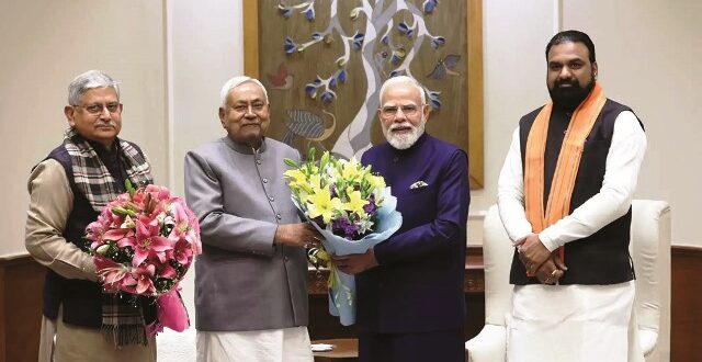 नई दिल्ली,22 दिसम्बर 2025। बिहार में हिजाब विवाद में बुरी तरह घिरे मुख्यमंत्री नीतीश कुमार ने सोमवार को दिल्ली में प्रधानमंत्री नरेंद्र मोदी से मुलाकात की। यह मुलाकात करीब 30 मिनट तक चली, जिसमें कई अहम राजनीतिक और प्रशासनिक मुद्दों पर चर्चा हुई। मुलाकात के दौरान मुख्यमंत्री नीतीश के साथ केंद्रीय मंत्री ललन सिंह और बिहार के उपमुख्यमंत्री सम्राट चौधरी भी मौजूद रहे। तीनों नेता एक ही वाहन से प्रधानमंत्री आवास पहुंचे थे,जिससे इस मुलाकात को राजनीतिक दृष्टि से काफी महत्वपूर्ण माना जा रहा है। गौरतलब है कि मुख्यमंत्री नीतीश कुमार रविवार को पटना से दिल्ली पहुंचे थे। बिहार विधानसभा चुनाव में भारी जीत के बाद यह उनका पहला दिल्ली दौरा है। ऐसे में इस मुलाकात को एनडीए के भीतर समन्वय और आगामी रणनीति से जोड़कर भी देखा जा रहा है। सूत्रों के अनुसार, प्रधानमंत्री मोदी और मुख्यमंत्री नीतीश कुमार के बीच मुख्य रूप से तीन मुद्दों पर बातचीत हुई। पहला और सबसे संवेदनशील मुद्दा हिजाब विवाद का रहा। हिजाब हटाने के बाद नुरसत परवीन के अब तक नौकरी जॉइन नही करने और इस मामले को लेकर देश-विदेश में हो रही बयानबाजी पर भी चर्चा की गई होगी, ऐसी संभावना जताई जा रही है। एनडीए नेतृत्व नहीं चाहता कि इस विवाद का असर 2026 में होने वाले पश्चिम बंगाल विधानसभा चुनाव पर पड़े। दूसरा अहम मुद्दा मंत्रिमंडल विस्तार को लेकर रहा। हाल ही में नितिन नबीन के मंत्री पद से इस्तीफा देने के बाद उनके पास रहे दो विभागों की जिम्मेदारी को लेकर पुनर्व्यवस्था आवश्यक हो गई है। ऐसे में नए मंत्रियों को शामिल करने या विभागों के पुनः बंटवारे पर भी विचार-विमर्श हुआ। तीसरा मुद्दा विभिन्न नीतियों से जुड़े वित्तीय पहलुओं का रहा।