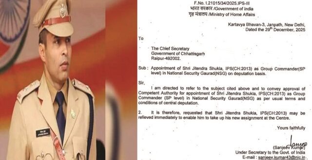 रायपुर,29 दिसम्बर 2025। छत्तीसगढ़ के आईपीएस अधिकारी जितेंद्र शुक्ला को केंद्र सरकार ने राष्ट्रीय सुरक्षा गार्ड में ग्रुप कमांडर के पद पर नियुक्त किया है। केंद्रीय गृह मंत्रालय ने राज्य सरकार को पत्र भेजकर जानकारी दी है। उन्हें तत्काल कार्यमुक्त करने का निर्देश दिया है। पत्र में कहा गया है कि 2013 बैच के अधिकारी जितेंद्र शुक्ला को केंद्रीय प्रतिनियुक्ति के तहत एनएसजी में एसपी स्तर के पद पर नियुक्त किया गया है। जितेंद्र शुक्ला मूलतः उत्तर प्रदेश के इलाहाबाद (प्रयागराज) के रहने वाले हैं। उनका जन्म 22 सितंबर 1983 को हुआ था। उन्होंने इलाहाबाद के राजकीय इंटर कॉलेज से स्कूली शिक्षा पूरी की और इलाहाबाद विश्वविद्यालय से बीए के बाद भूगोल विषय में एमए किया। पढ़ाई पूरी करने के बाद उन्होंने सिविल सेवा परीक्षा की तैयारी शुरू की।