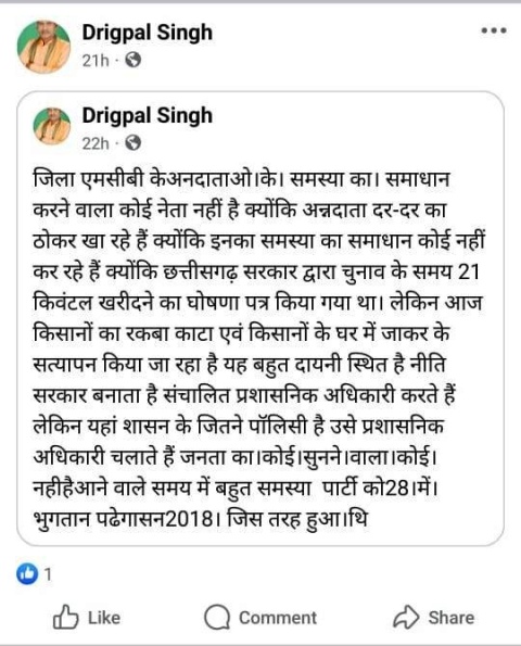 दृगपाल सिंह ने फेसबुक पर लिखते हुए कहा कि एमसीबी जिले के अन्नदाता दर-दर भटक रहे हैं और उनकी समस्याओं का समाधान करने वाला कोई नहीं है, चुनाव के समय 21 मि्ंटल धान खरीदी का वादा किया गया था,लेकिन अब रकबा कटौती और घर-घर सत्यापन जैसी प्रक्रियाओं से किसानों की परेशानी बढ़ गई है, उन्होंने चेतावनी देते हुए लिखा कि नीतियां सरकार बनाती है,पर प्रशासनिक अमला उन्हें ऐसे लागू कर रहा है कि जनता की सुनवाई नहीं हो रही,यदि यही हाल रहा तो आने वाले समय में पार्टी को भारी नुकसान होगा 2028 में वही भुगतना पड़ेगा, जैसा 2018 में हुआ था।
